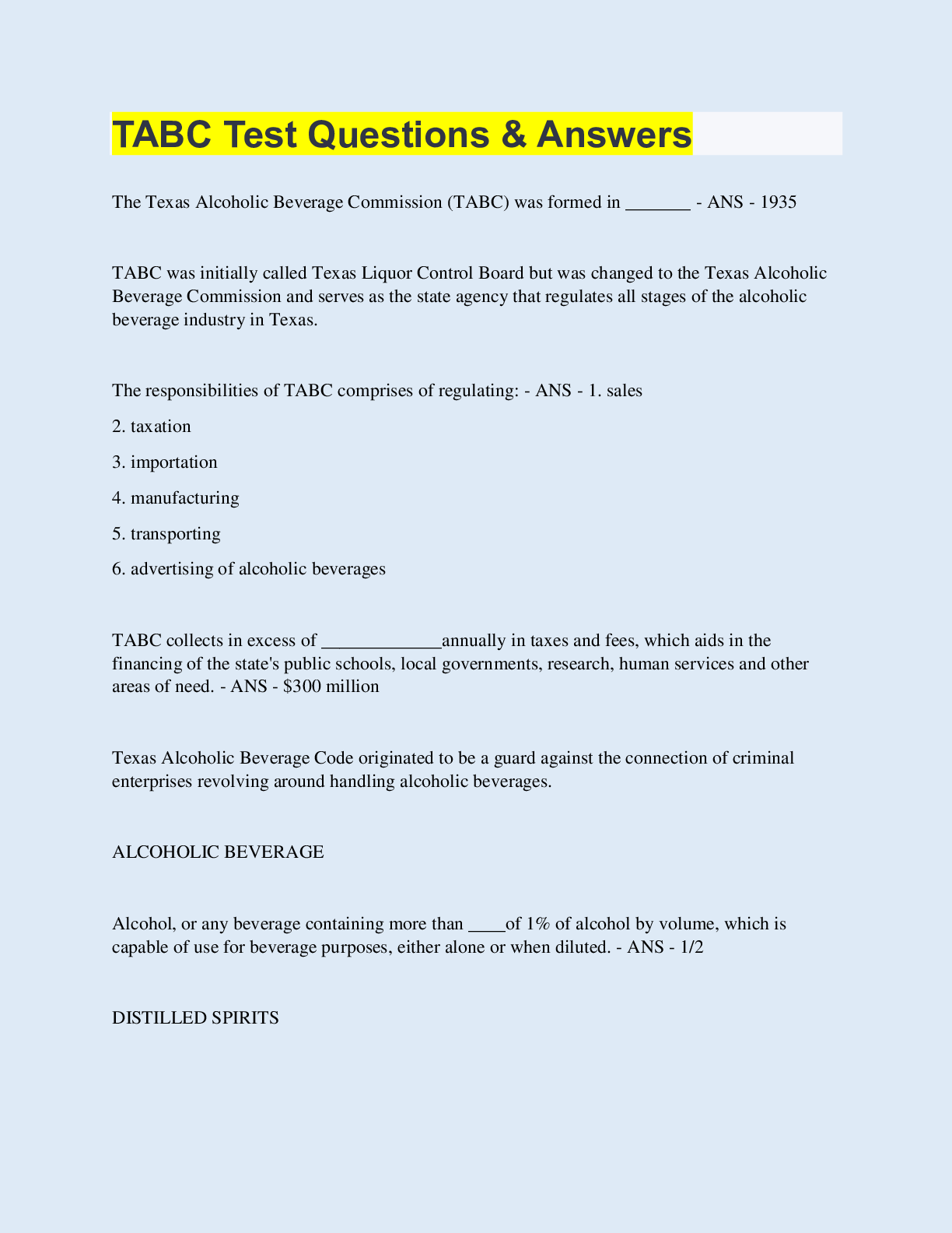 Food and Nutrition > EXAM > TABC Test Questions & Answers | 80 Questions with 100% Correct Answers | Updated & Verified (All)
