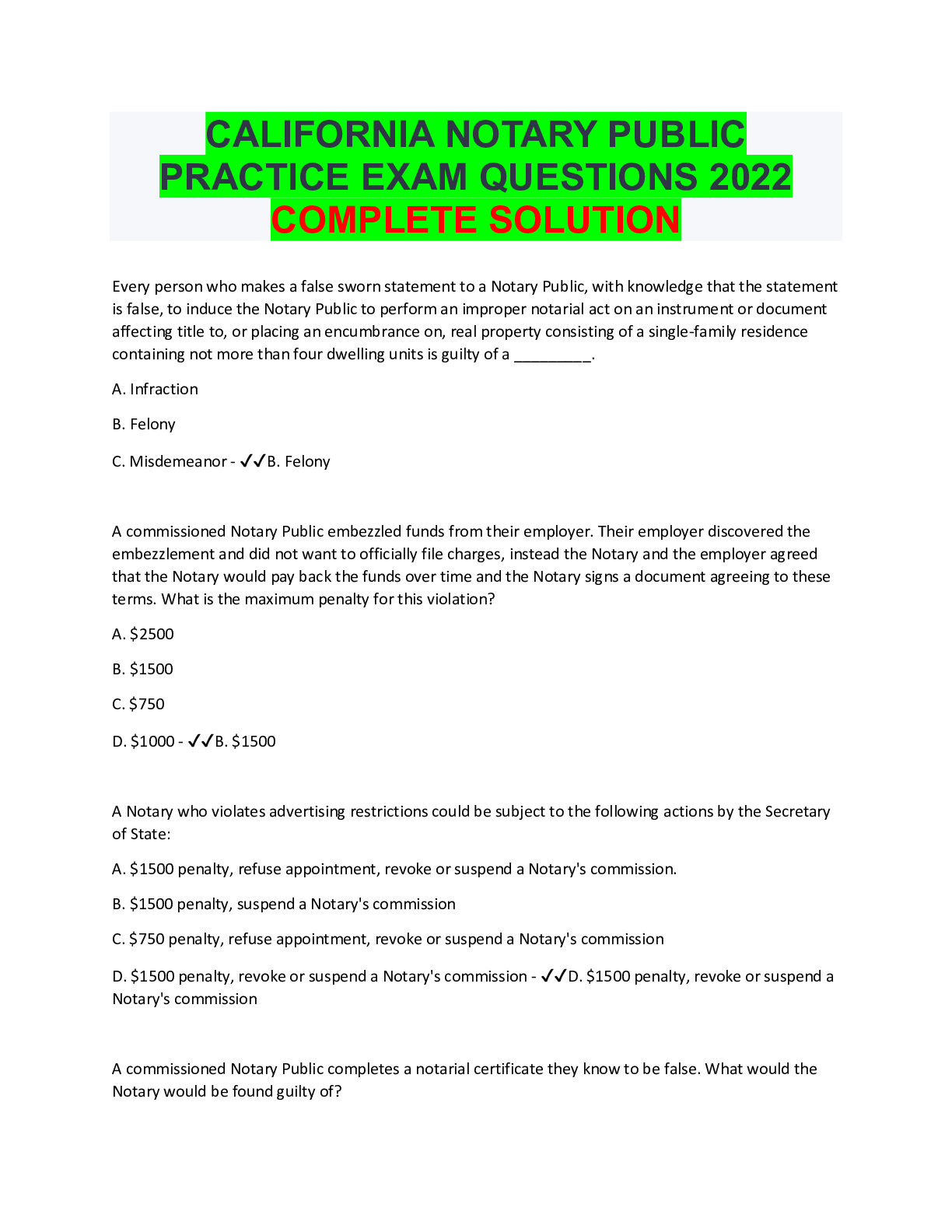Civil Engineering > EXAM > CALIFORNIA NOTARY PUBLIC PRACTICE EXAM QUESTIONS 2022 COMPLETE SOLUTION (All)