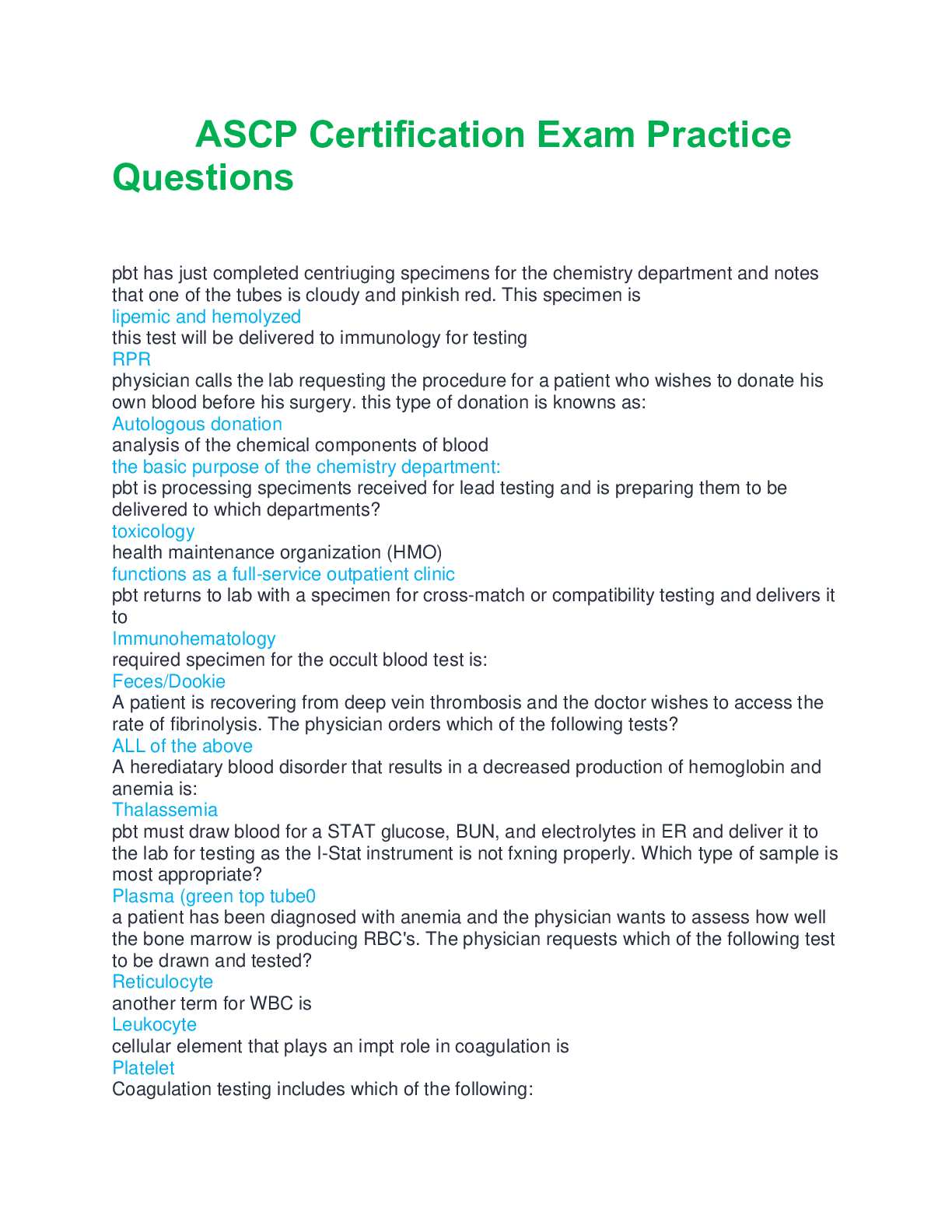 Pathology > EXAM > ASCP patholCertification Exam Practice Questions and answers correctly complete solution 100% 2024/ 2025 (All)