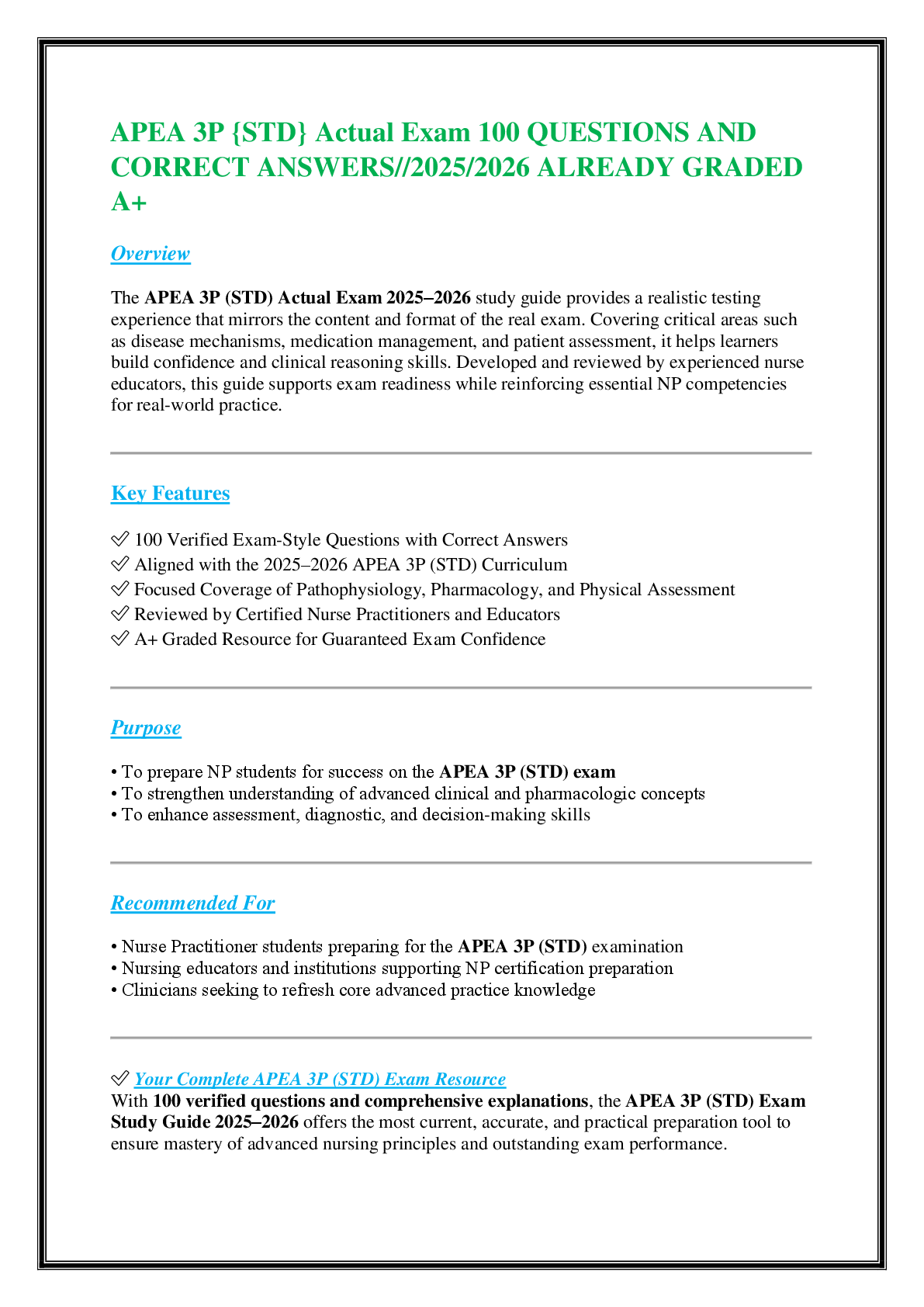 *NURSING > EXAM > APEA 3P {STD} Actual Exam 100 QUESTIONS AND CORRECT ANSWERS//2025/2026 ALREADY GRADED A+ (All)