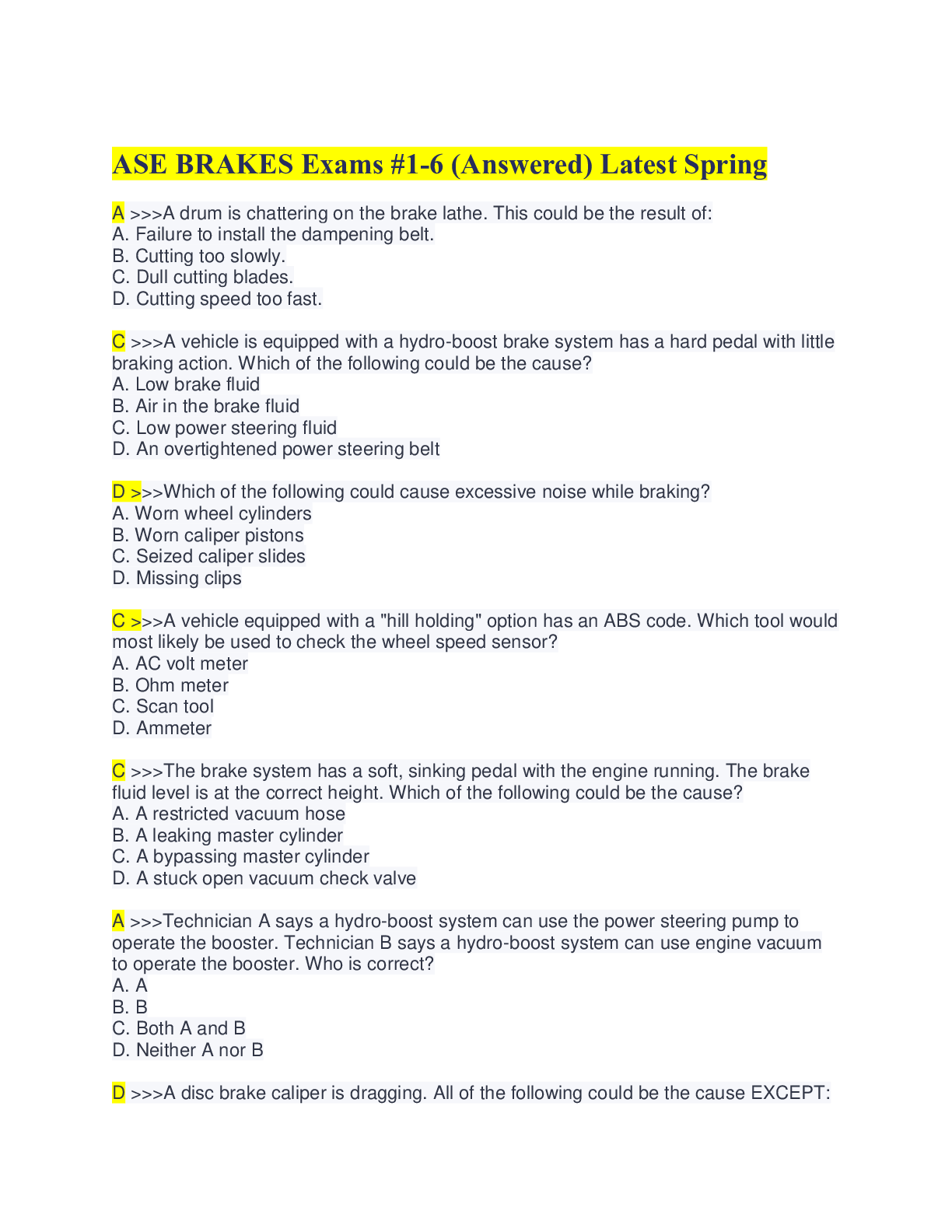 Driving Course > PLAY ANALYSIS > ASE BRAKES Exams #1-6 (Answered) Latest Spring (All)