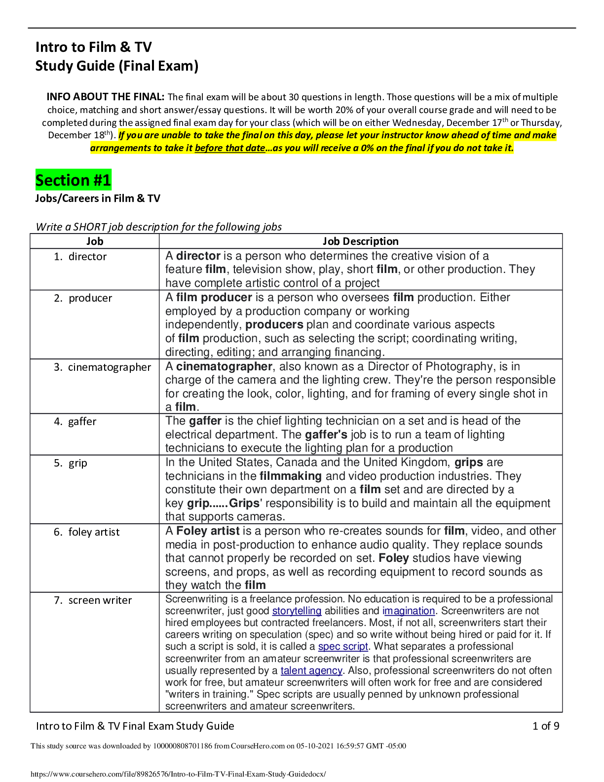 Film Studies > STUDY GUIDE > INFO ABOUT THE INTRO TO FILM TV - Final Exam Study Guide (All)