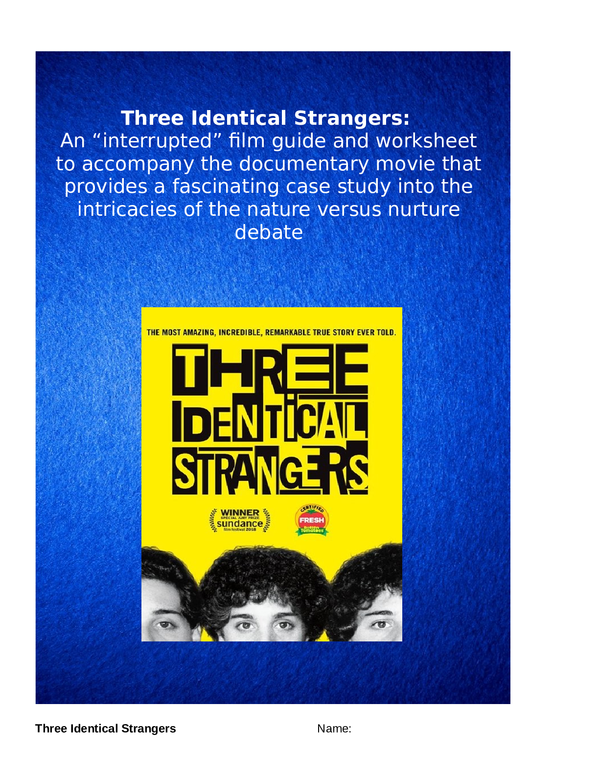 Film Studies > STUDY GUIDE > Three Identical Strangers:InterruptedFilmGuideandWorksheetwithAnswers (All)