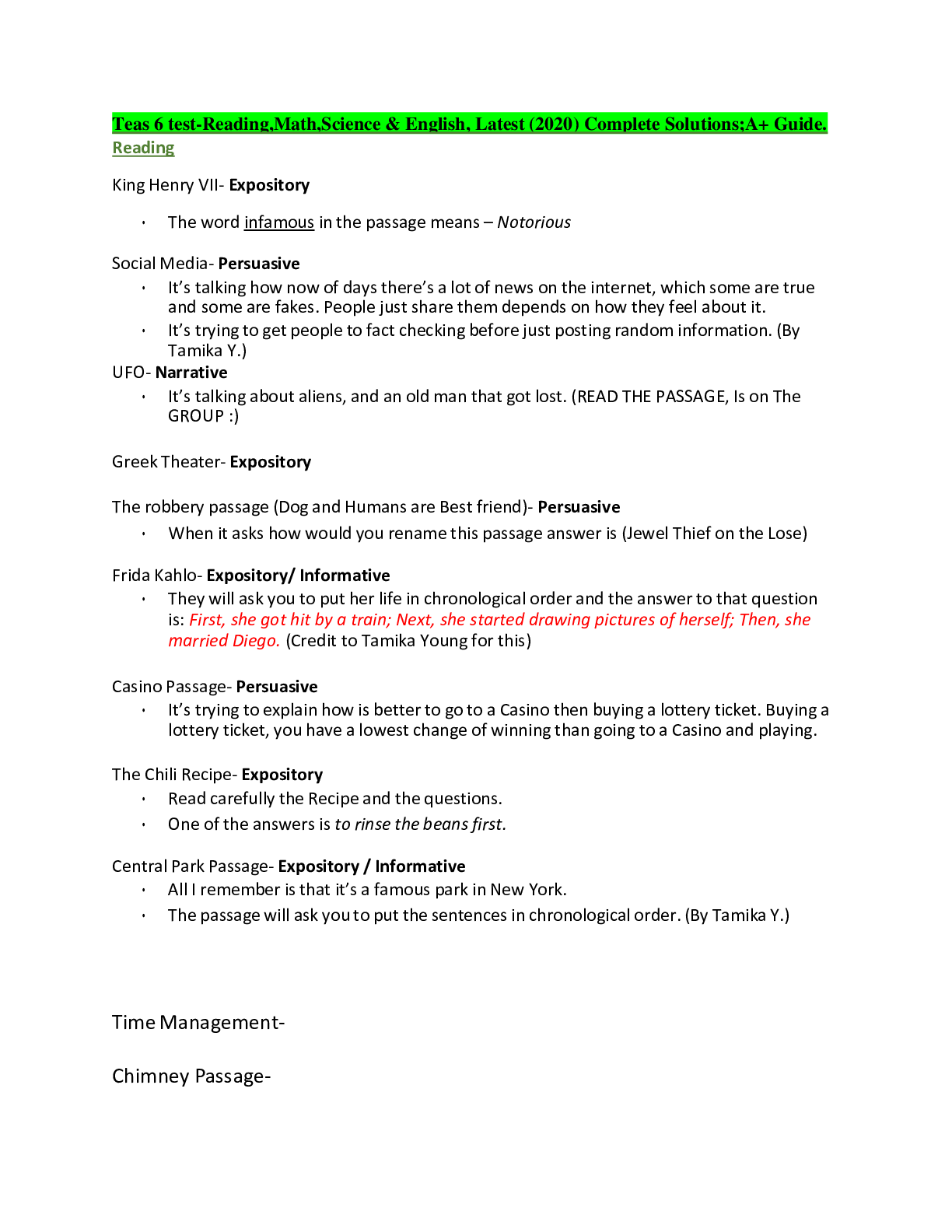 SCIENCE 101 > STUDY GUIDE > Teas 6 test-Reading,Math,Science & English, Latest (2020) Complete Solutions;A+ Guide. (All)