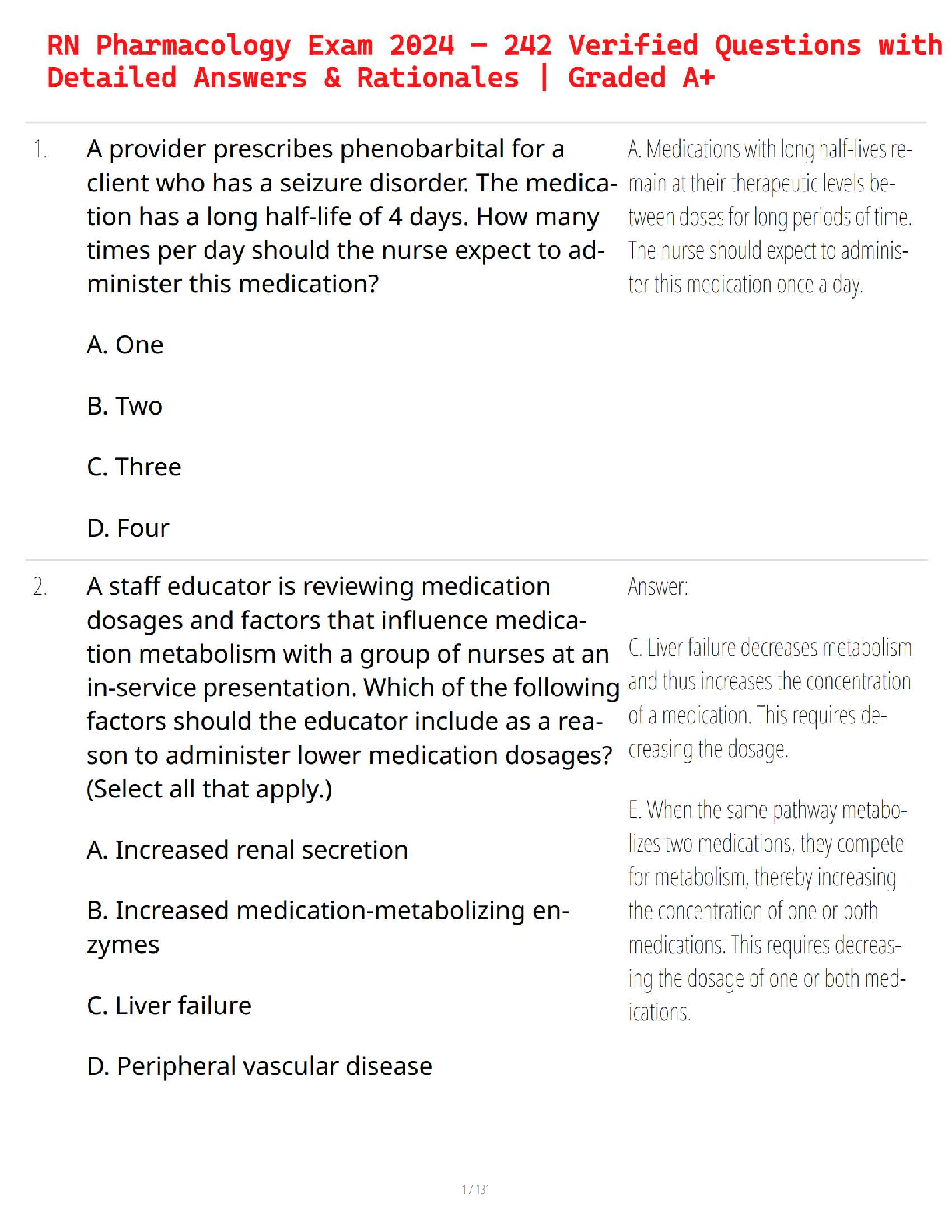 Pharmacology for Nursing Care > STUDY GUIDE > RN Pharmacology Exam 2024 – 242 Verified Questions with Detailed Answers & Rationales | Expert-Reviewed (All)