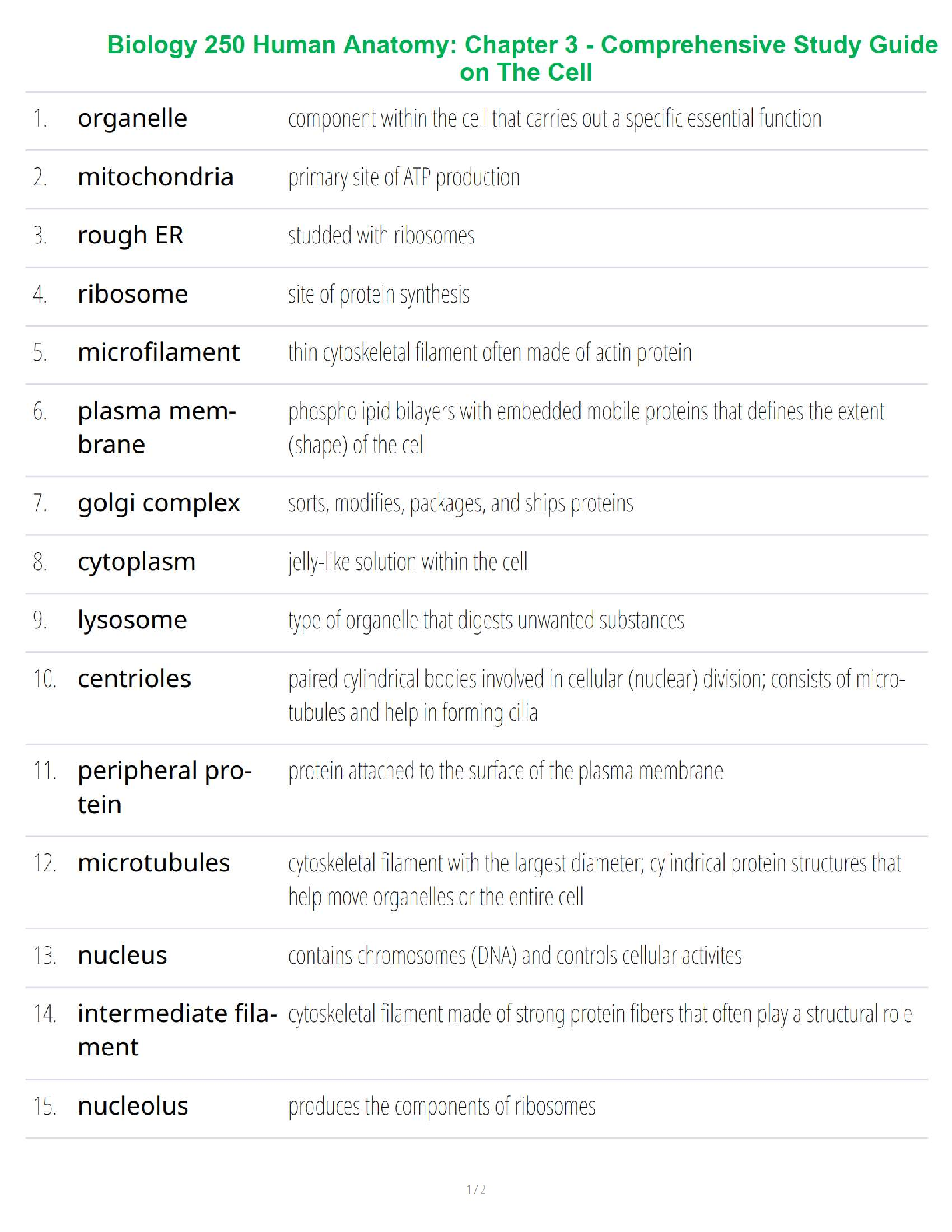 Human Anatomy and Physiology > STUDY GUIDE > Biology 250 Human Anatomy: Chapter 3 - Comprehensive Study Guide on The Cell (All)