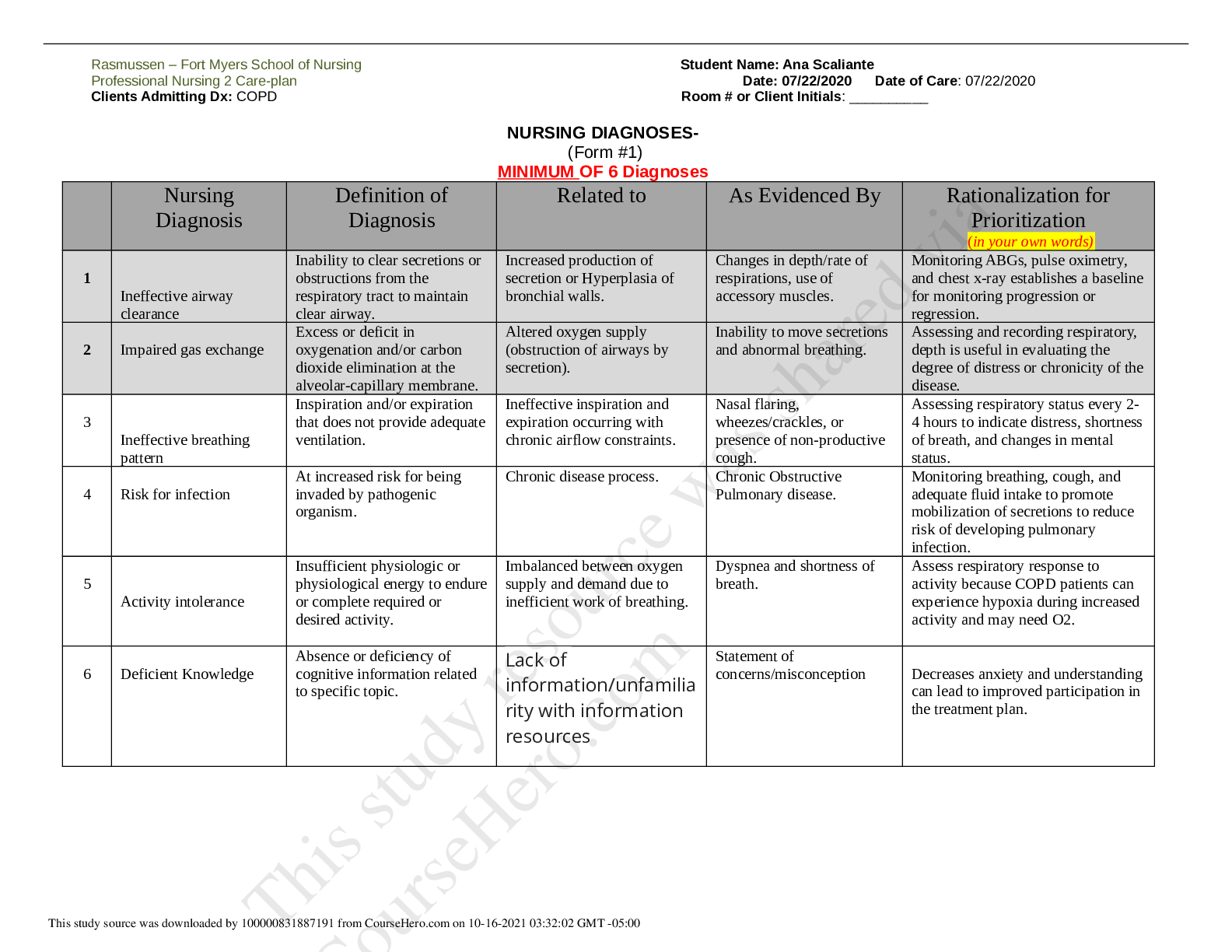 *NURSING > STUDY GUIDE > (complete) Rasmussen College NUR 2571 COPD care plan (All)