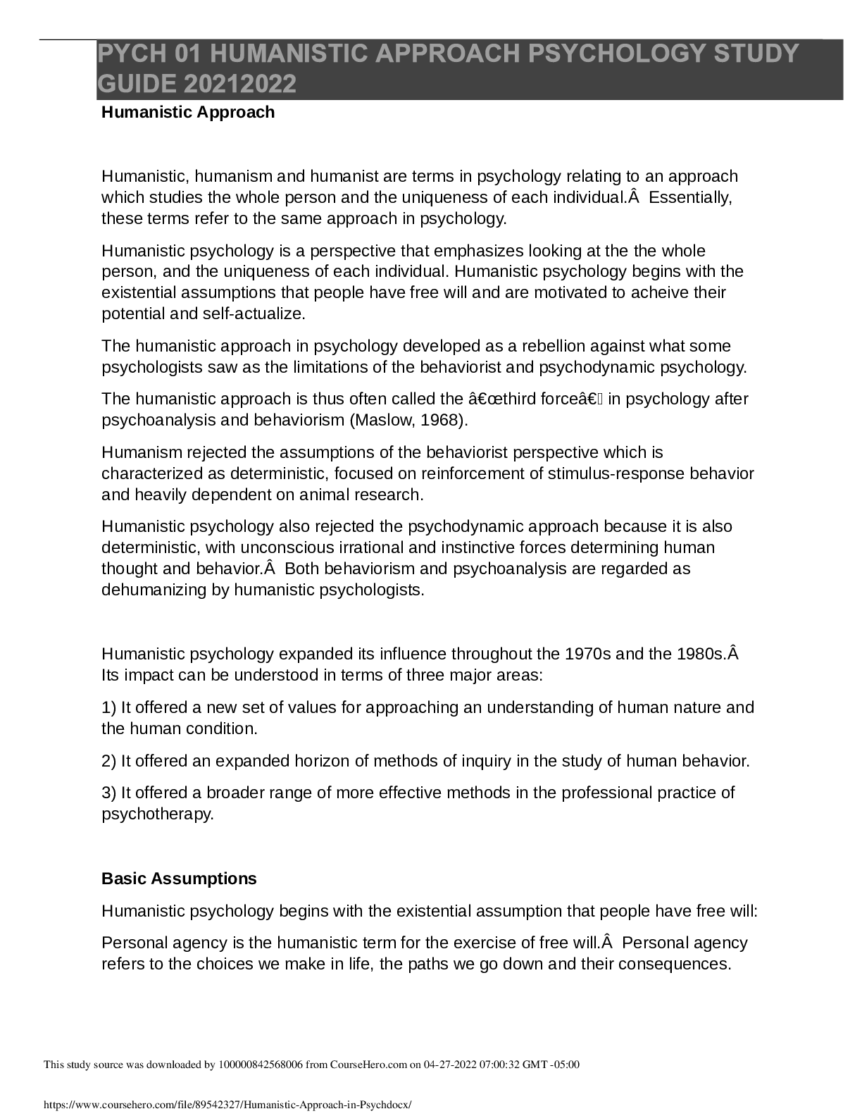 Psychology > STUDY GUIDE > PYCH 01 HUMANISTIC APPROACH PSYCHOLOGY STUDY GUIDE 20212022 (All)