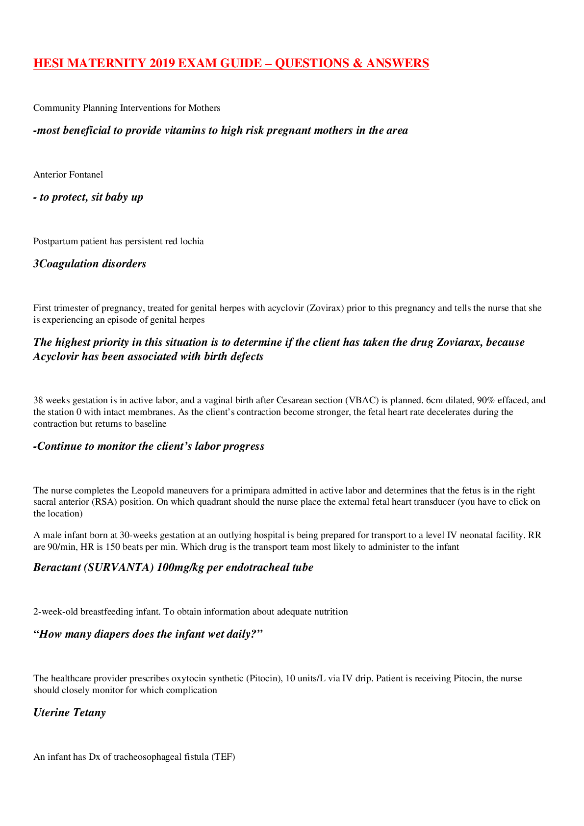 Health Care > STUDY GUIDE > HESI MATERNITY 2019 EXAM GUIDE – QUESTIONS & ANSWERS (All)