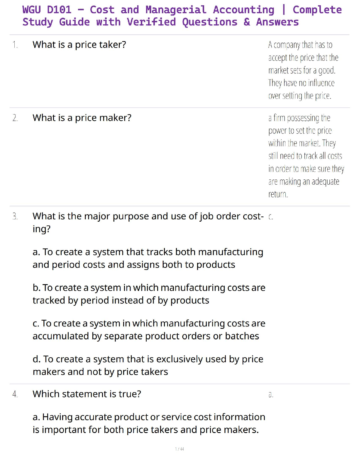 Accounting > STUDY GUIDE > WGU D101 – Cost and Managerial Accounting | Complete Study Guide with Verified Questions & Answers (All)