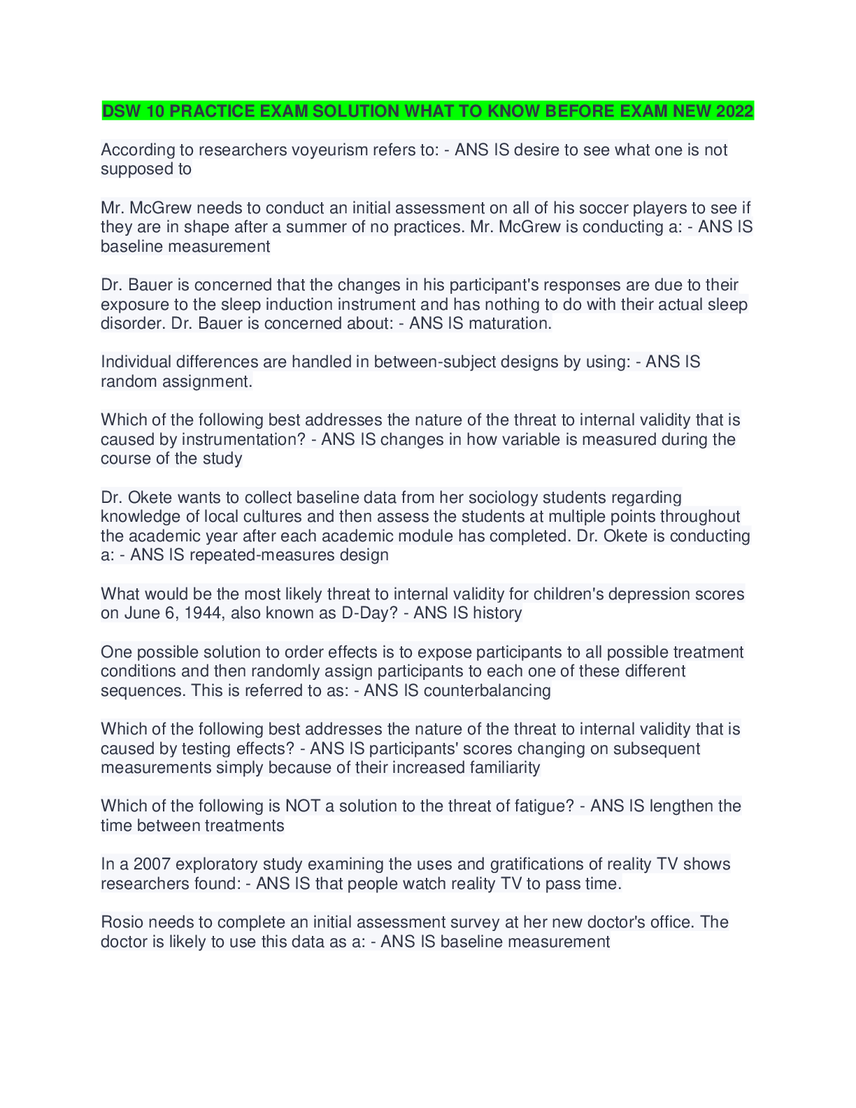 Education > Summary > DSW 10 PRACTICE EXAM SOLUTION WHAT TO KNOW BEFORE EXAM NEW 2022 (All)