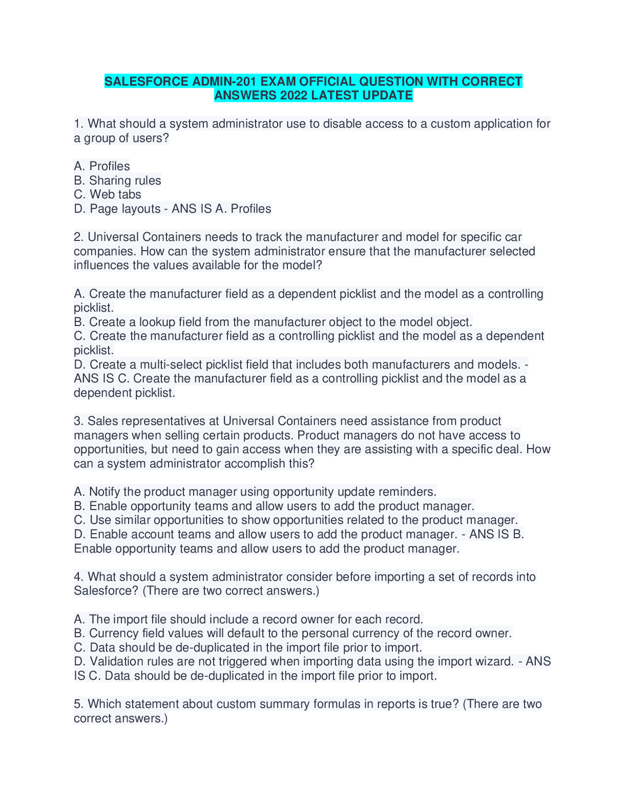 Education > Summary > SALESFORCE ADMIN-201 EXAM OFFICIAL QUESTION WITH CORRECT ANSWERS 2022 LATEST UPDATE (All)