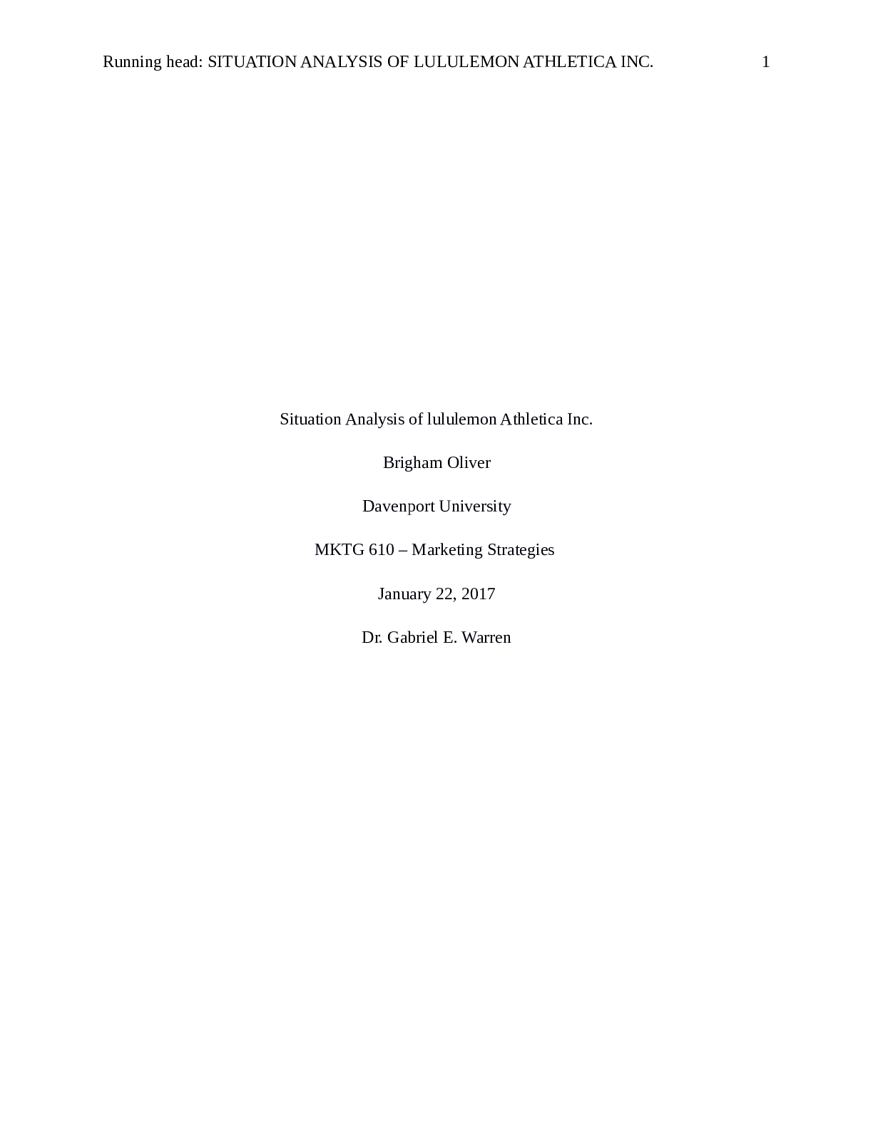 Marketing > Summary > MKTG 610 Situation Analysis of lululemon Athletica Inc. Davenport University (All)