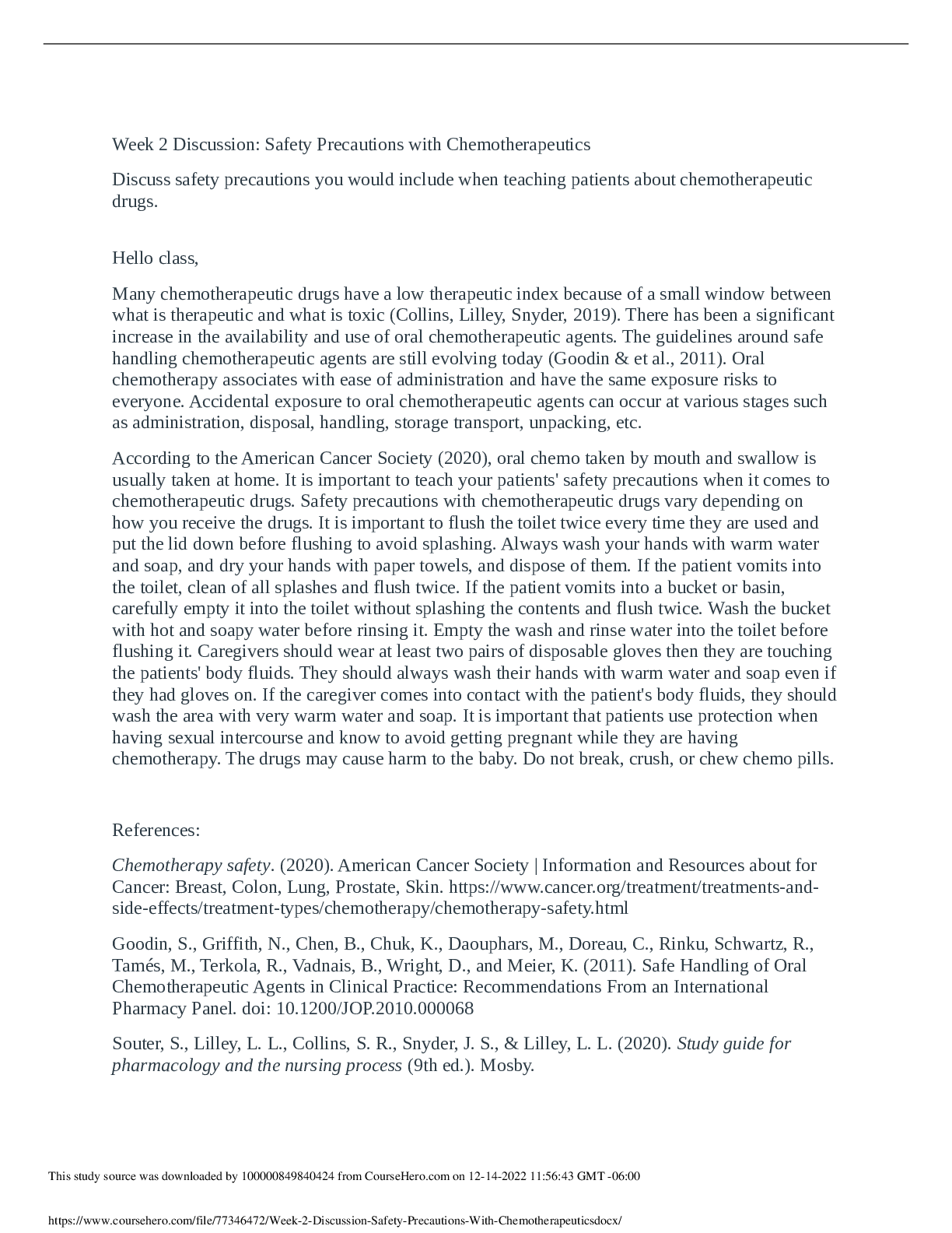 Pharmacology > DISCUSSION POST > NR 293 Week 2 Discussion: Safety Precautions with Chemotherapeutics | Download To Score An A (All)