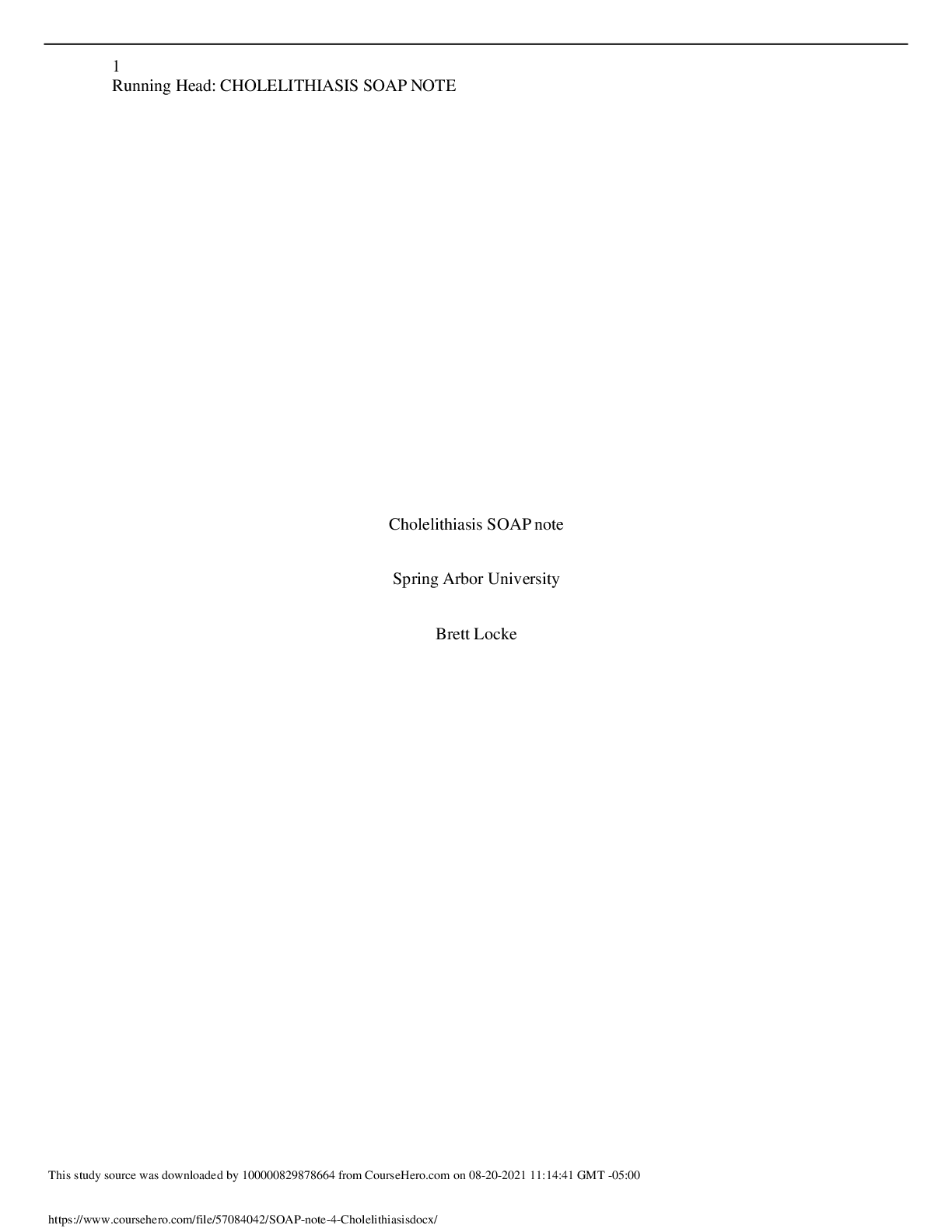 *NURSING > SOAP NOTE > Cholelithiasis SOAP note Spring Arbor University Brett Locke (All)