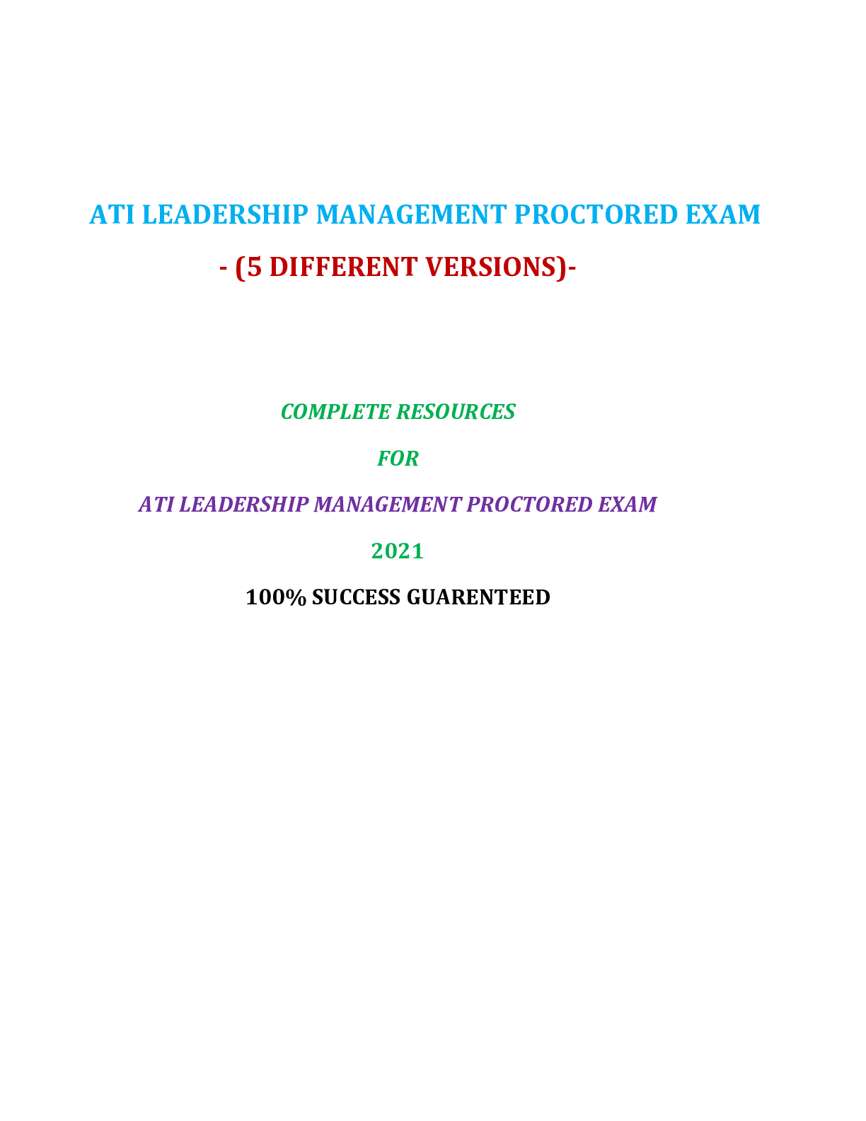 Health Care > QUESTIONS and ANSWERS > ATI LEADERSHIP MANAGEMENT PROCTORED EXAM (5 VERSIONS) / LEADERSHIP MANAGEMENT ATI PROCTORED EXAM (5 VERSIONS) (500+ Q&A 100% CORRECT) | VERIFIED AND RATED 100%: COMPLETE GUIDE (All)