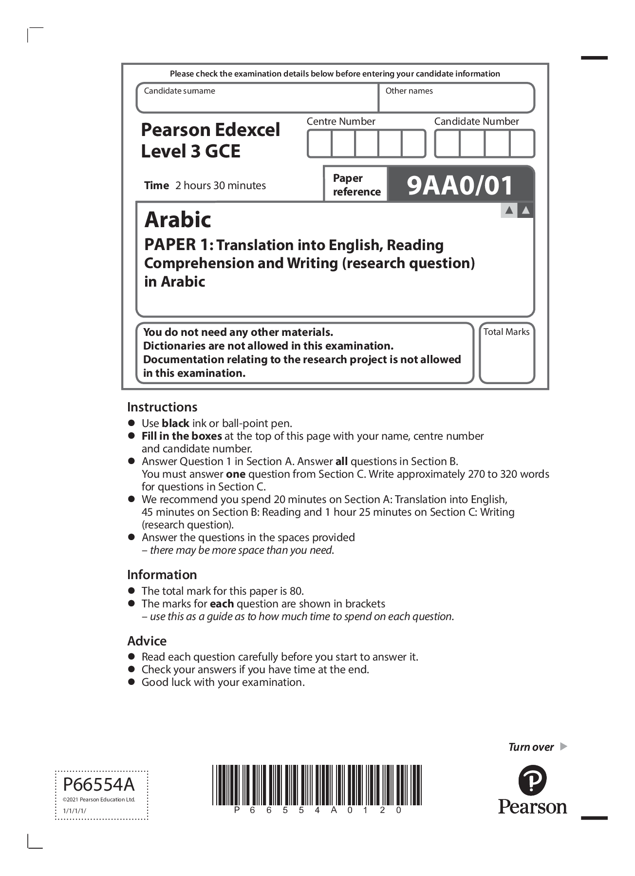 English > QUESTION PAPER (QP) > Pearson Edexcel Level 3 GCE/ Arabic PAPER 1: Translation into English, Reading Comprehension and Writing (research question) in Arabic (All)