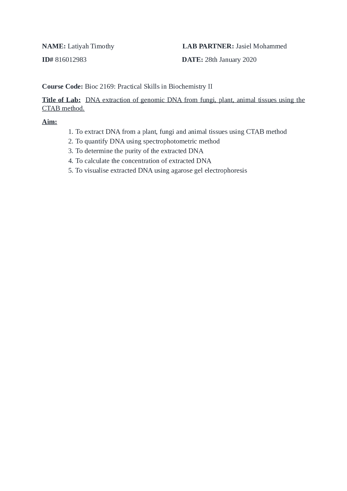 BioChemistry > Lab Experiment > University of the West Indies at St. Augustine - BIOC 2169dna lab write up (All)
