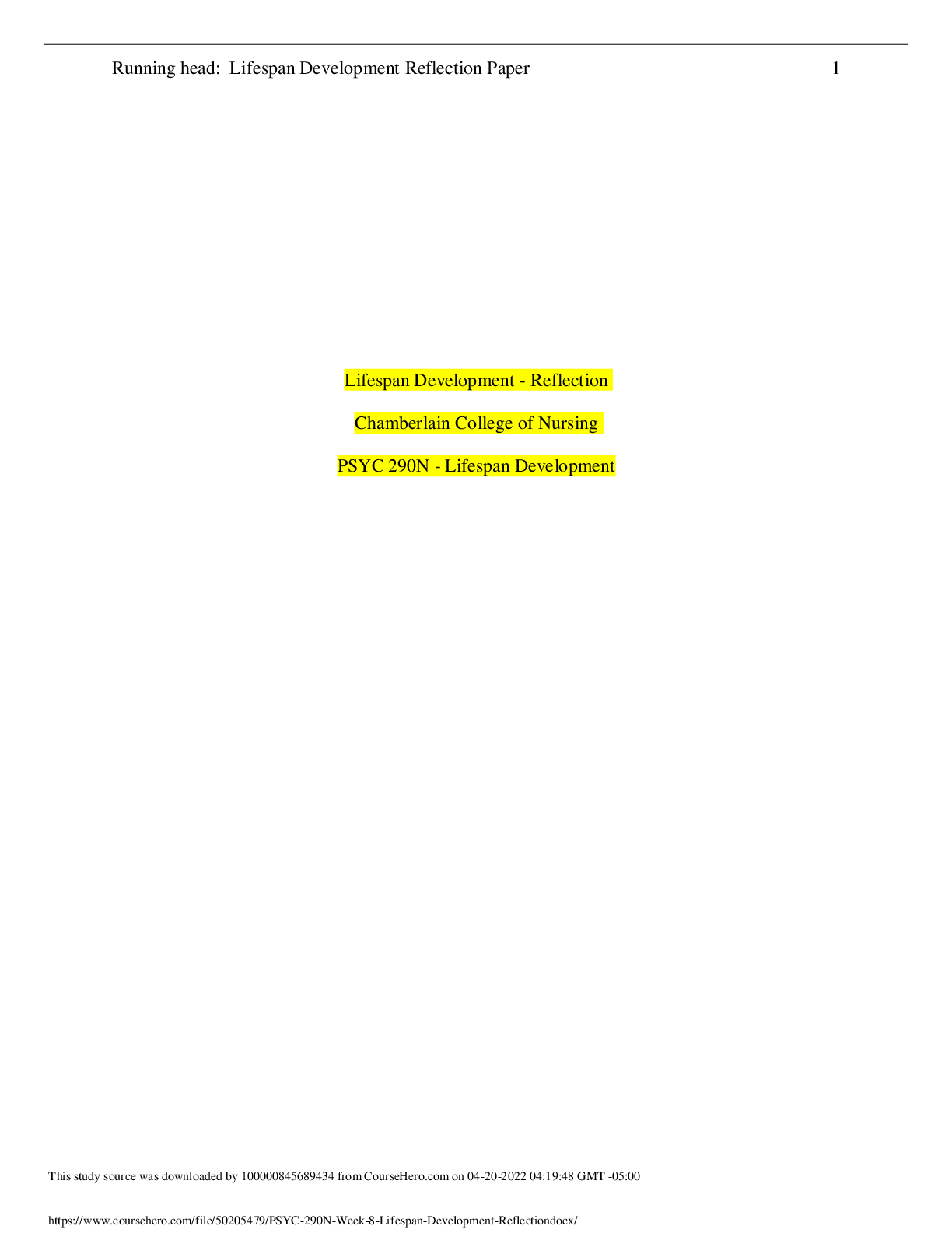Physiology > CASE STUDY > PSYC 290N Week 8 Lifespan Development: Reflection (GREADED A} (All)