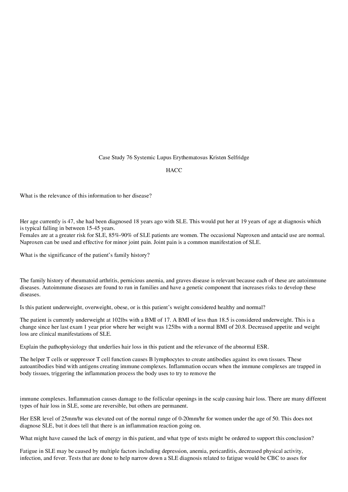 Biology > CASE STUDY > Case Study 76 Systemic Lupus Erythematosus | Case Study 76 SLE, answered (All)