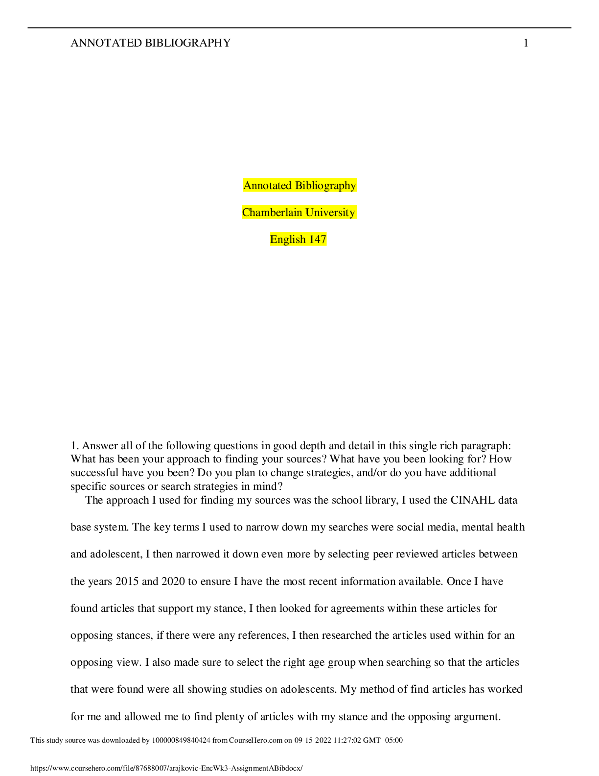 English > CASE STUDY > ENGL 147N Week 3 Assignment: Guided Annotated Bibliography: Reading Critically and Practicing Summary, Paraphrase, and Quotation (graded A) (All)
