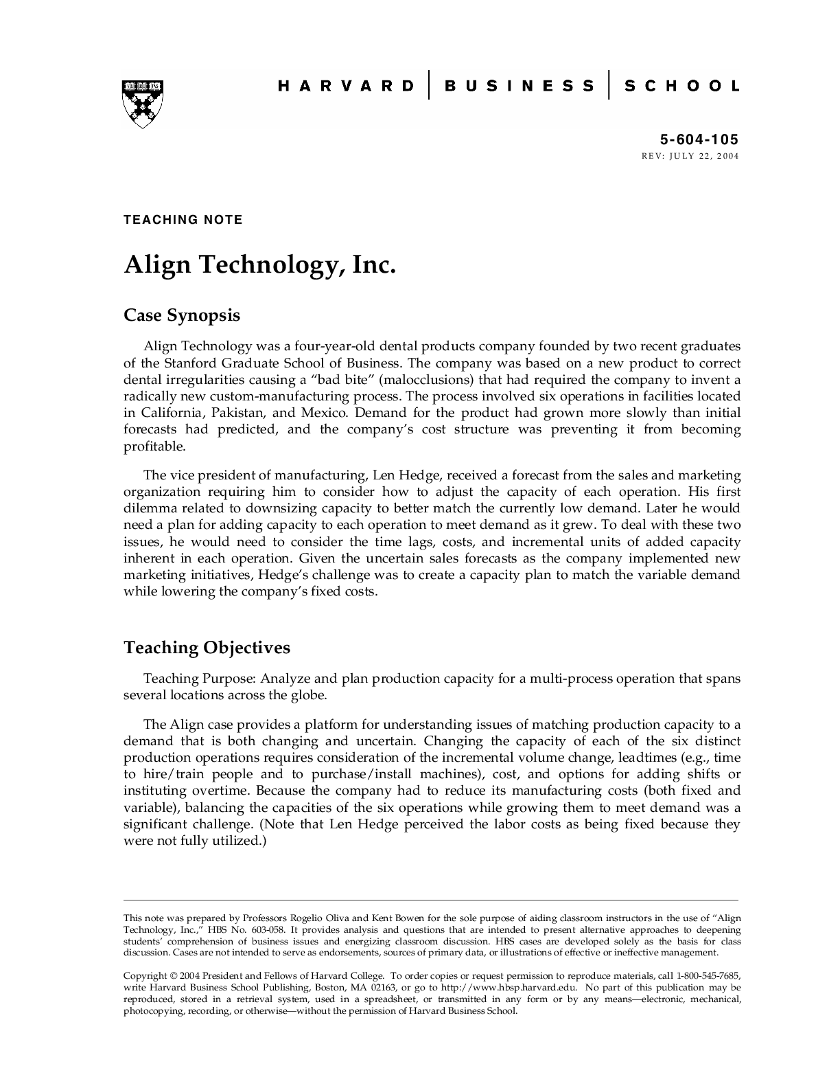 Marketing > CASE STUDY > Case Solutions/ Notes for Align Technology Inc,. Matching Manufacturing Capacity to Sales Demand by Kent Bowen Jonathan Groberg (All)