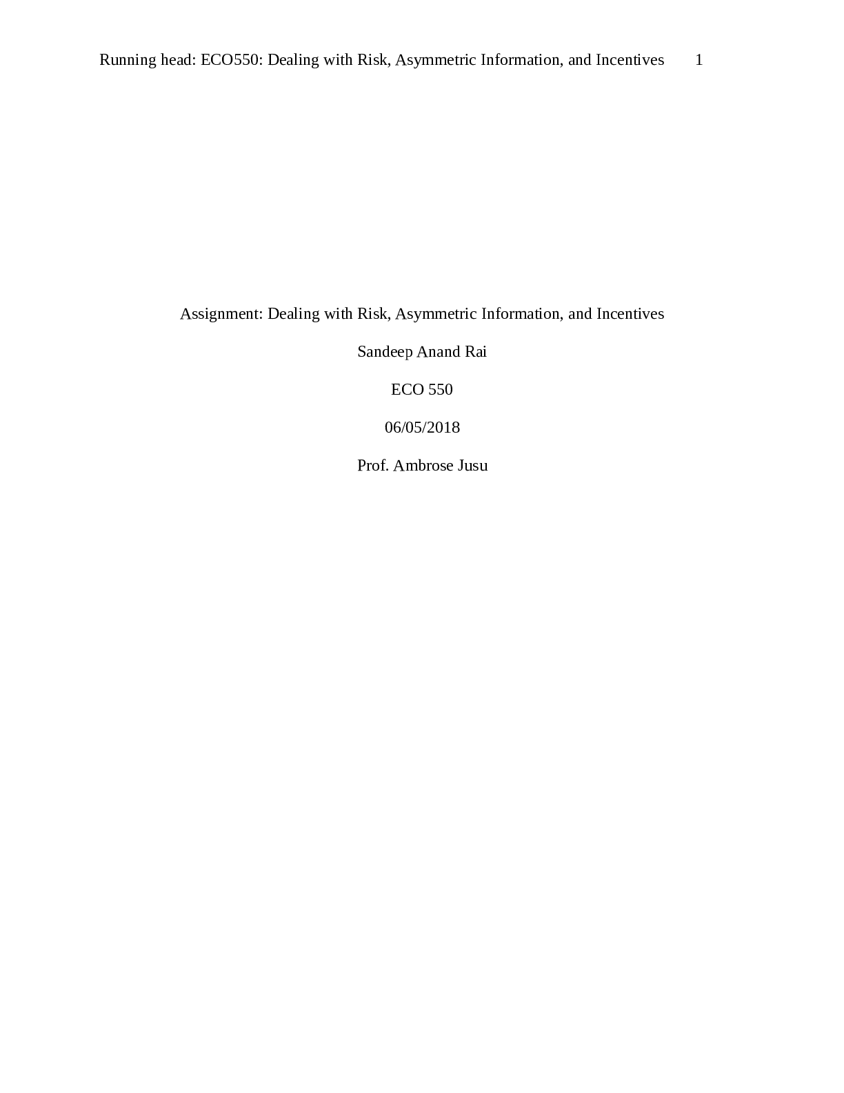 Risk Management and Insurance > CASE STUDY > Case Study-Dealing with Risk and Uncertainty | Assignment: Dealing with Risk, Asymmetric Information, and Incentives ECO 550; complete guide_latest summer 2021 (All)