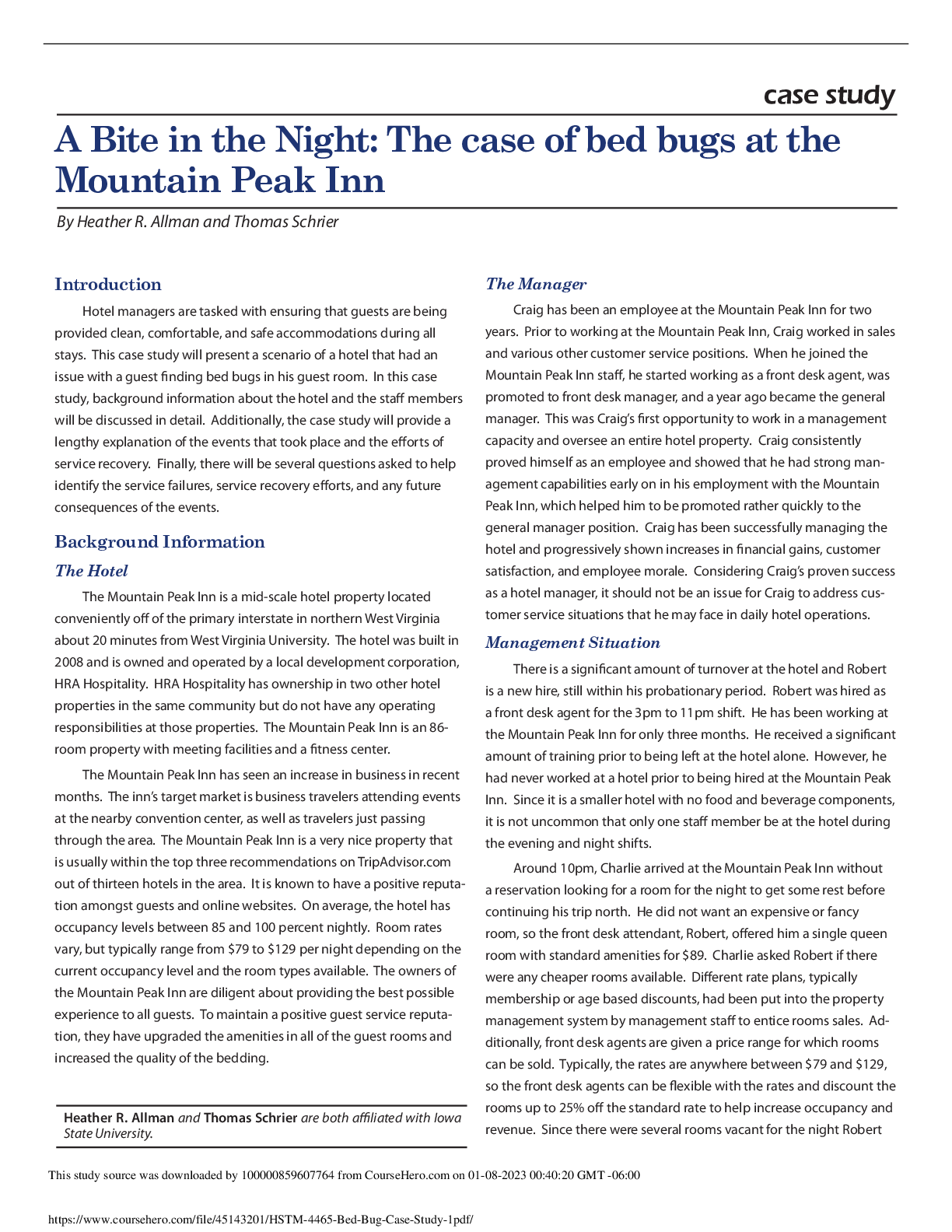 Food and Nutrition > CASE STUDY > Case Study> A Bite in the Night: The case of bed bugs at the Mountain Peak Inn. HSTM 4465_Troy University, Troy HSTM 4465 (All)