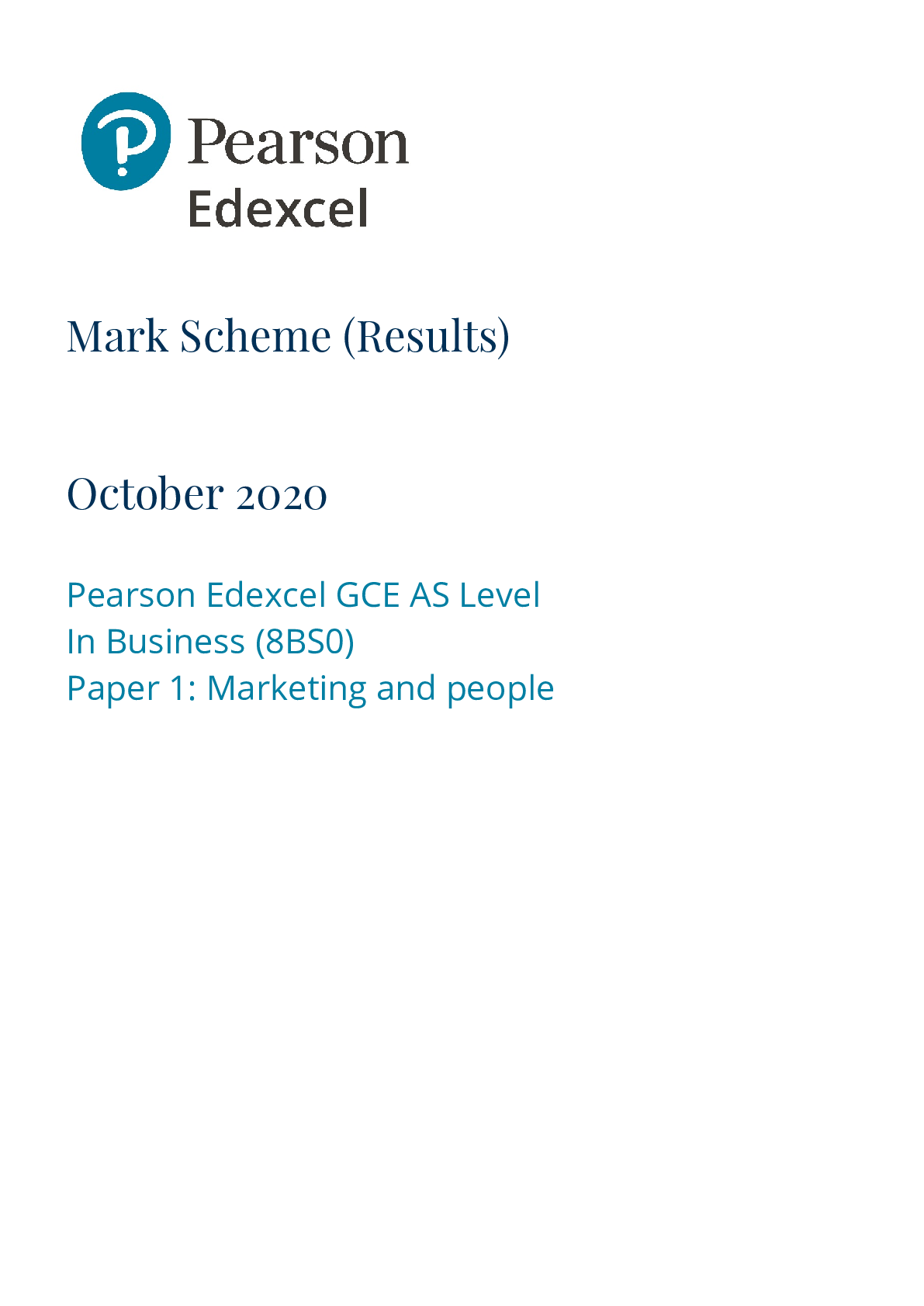 Business > MARK SCHEMES > Pearson Edexcel GCE AS Level In Business (8BS0) Paper 1: Marketing and people Mark Scheme 2020 (All)