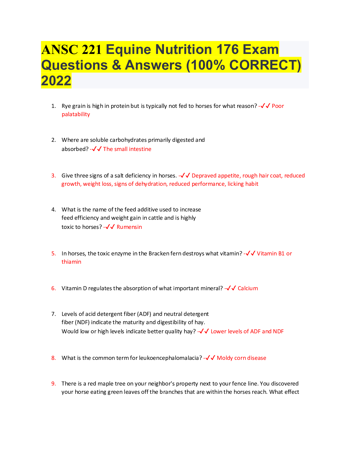 Nutrition > AQA > ANSC 221 Equine Nutrition 176 Exam Questions & Answers (100% CORRECT) 2022 (All)