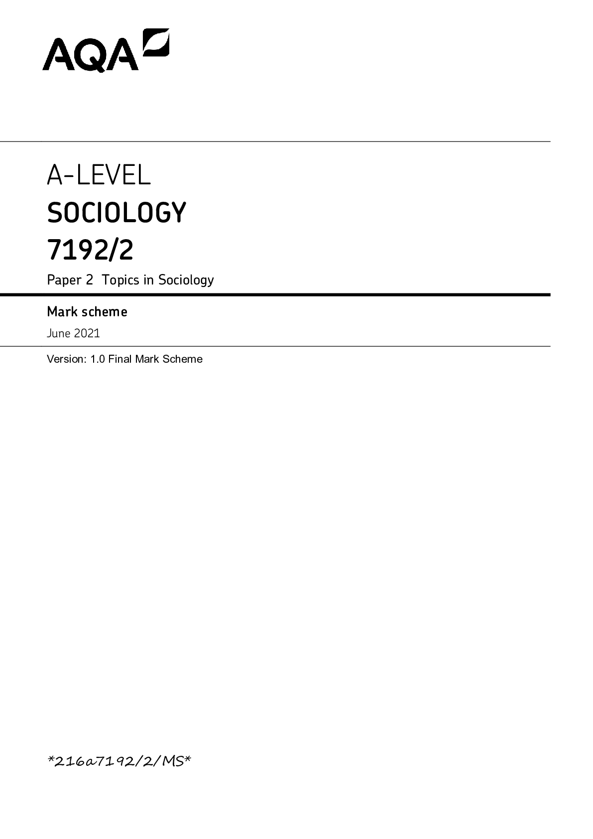 Sociology > AQA > AQA A-LEVEL SOCIOLOGY 7192/2 Paper 2 Topics in Sociology Mark scheme June 2021 Version: 1.0 Final Mark Scheme (All)