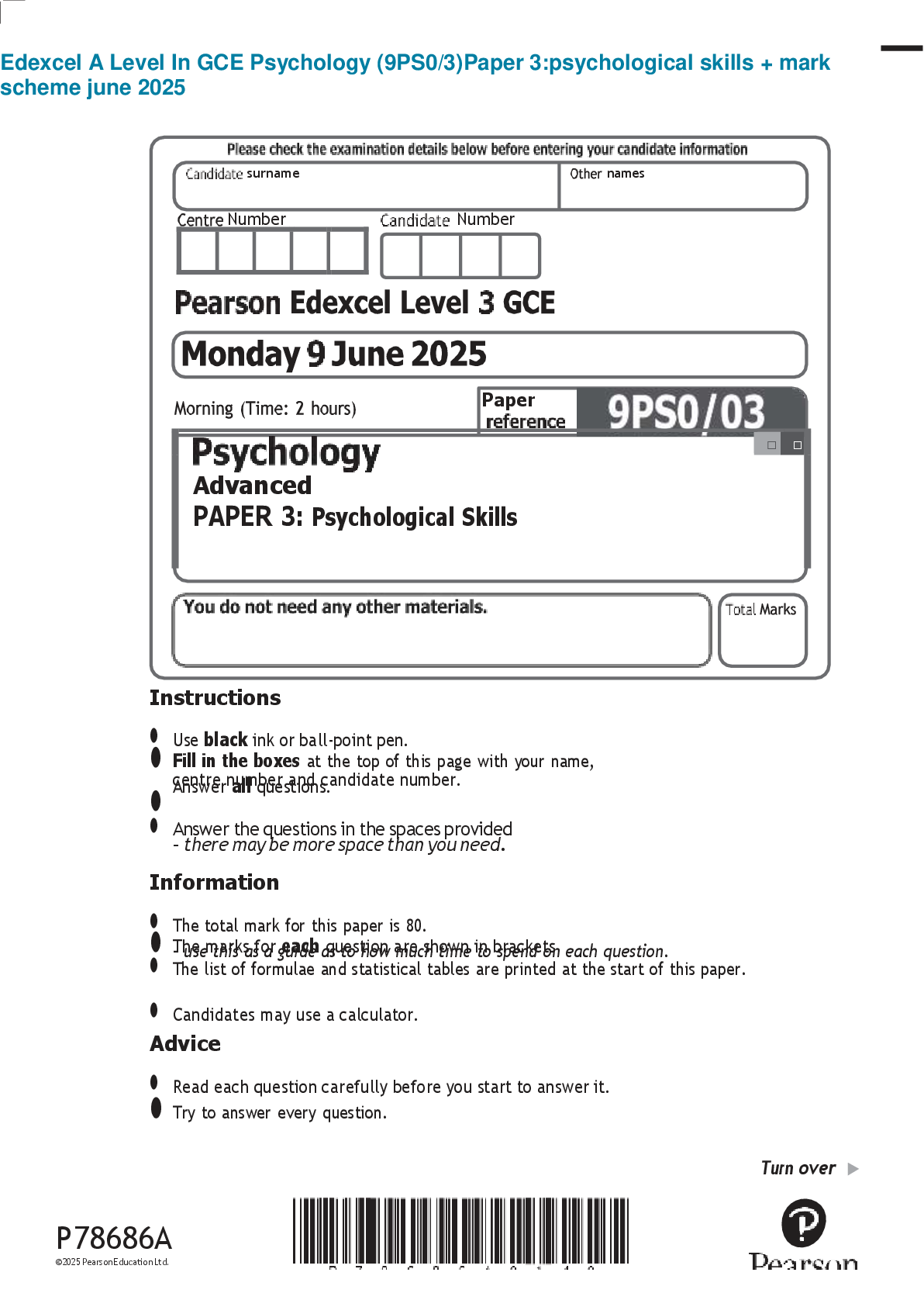 Psychology > Edexcel > Edexcel A Level In GCE Psychology (9PS0/3)Paper 3:psychological skills + mark scheme june 2025 (All)