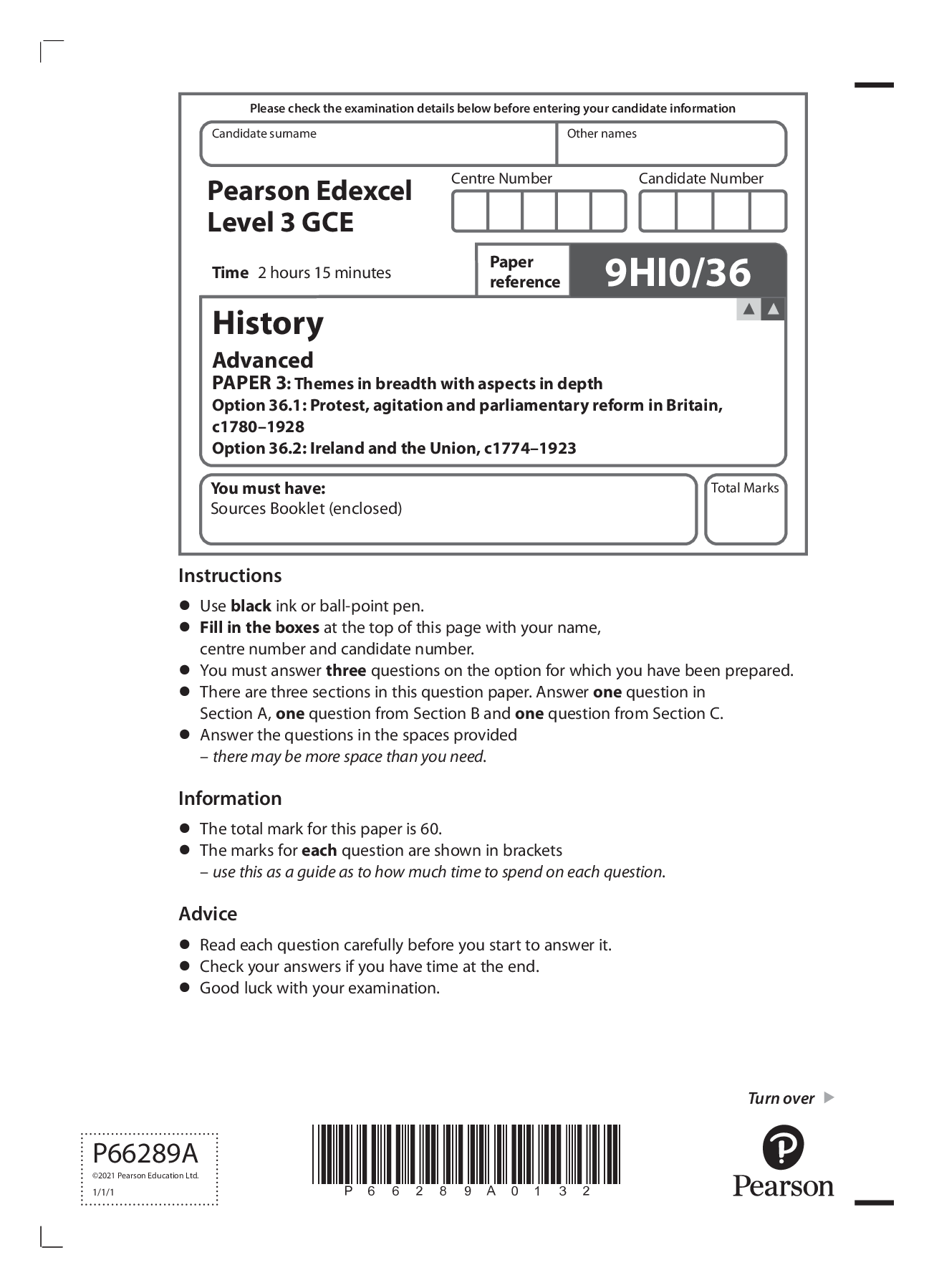 History > Edexcel > Pearson Edexcel GCE In History (9HI0) Paper 3: Themes in breadth with aspects in depth Option 36.1: Protest, agitation and parliamentary reform in Britain, c1780–1928 Option 36.2: Ireland and the Union, c1774–1923 (All)