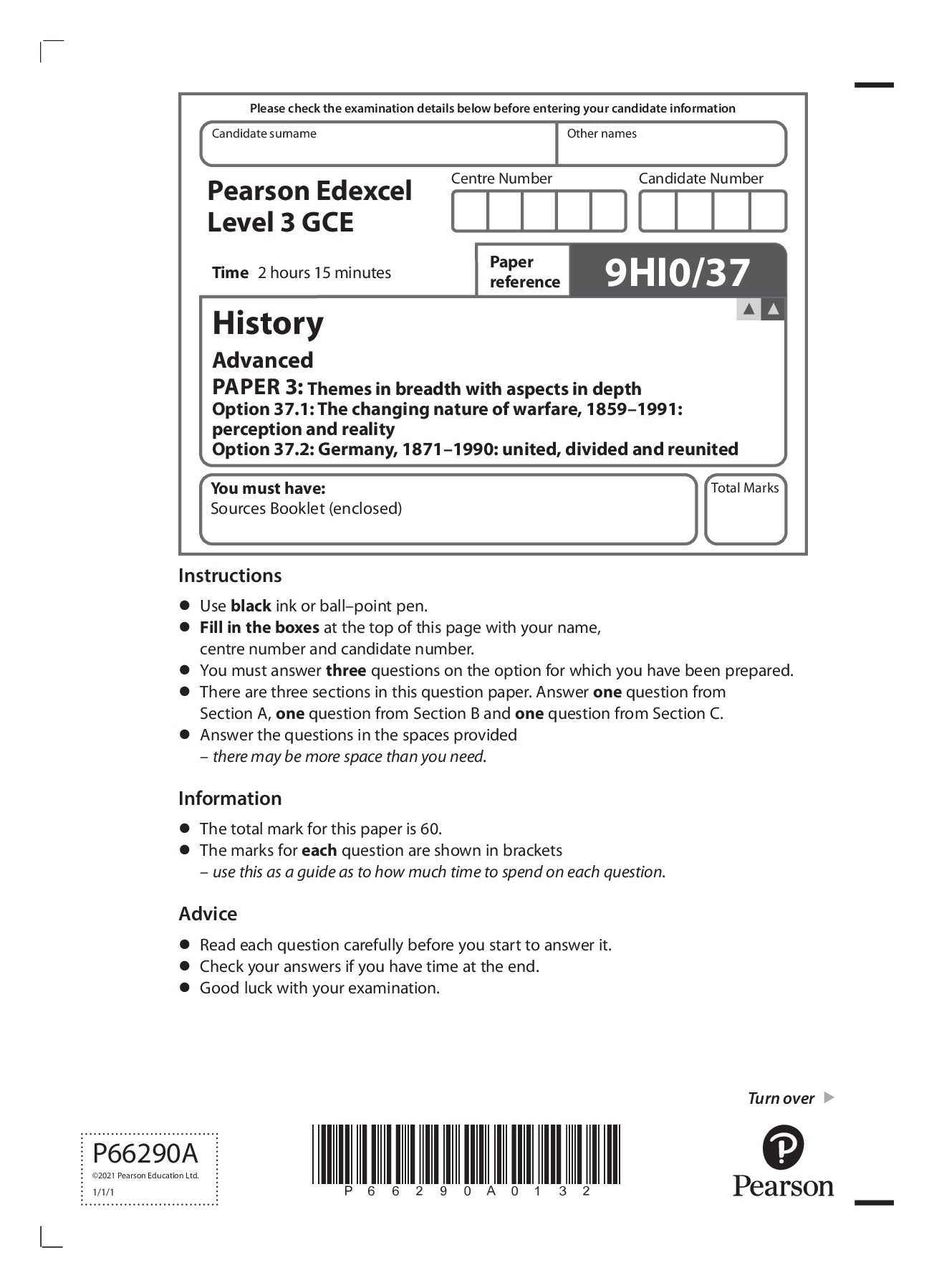 History > Edexcel > Pearson Edexcel GCE In History (9HI0) Paper 3: Themes in breadth with aspects in depth Option 37.1: The changing nature of warfare, 1859–1991: perception and reality Option 37.2: Germany, 1871–1990: united, divided and reunited (All)