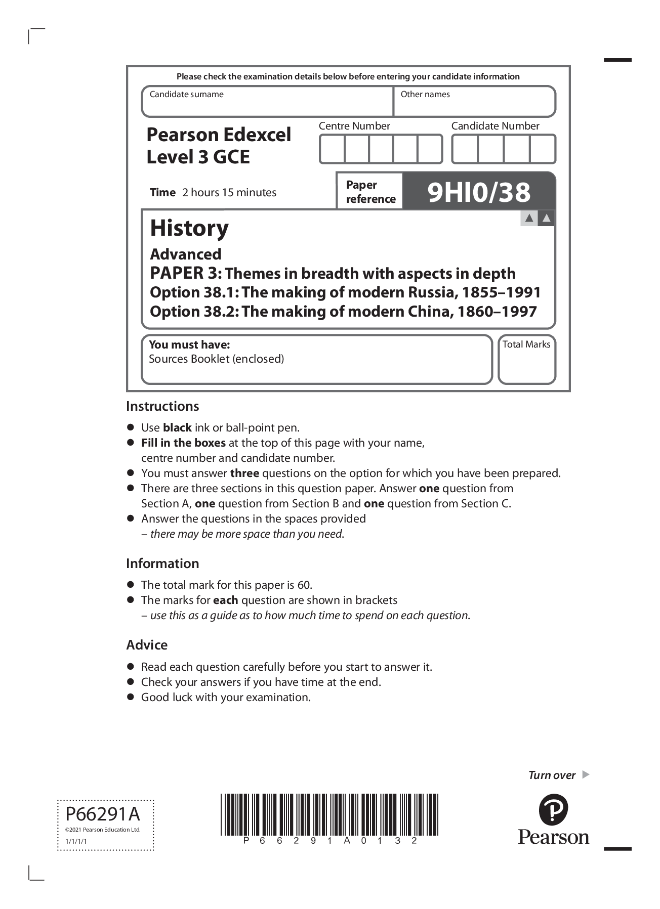 History > Edexcel > Pearson Edexcel GCE In History (9HI0) Paper 3: Themes in breadth with aspects in depth Option 38.1: The making of modern Russia, 1855– 1991 Option 38.2: The making of modern China, 1860– 1997 (All)