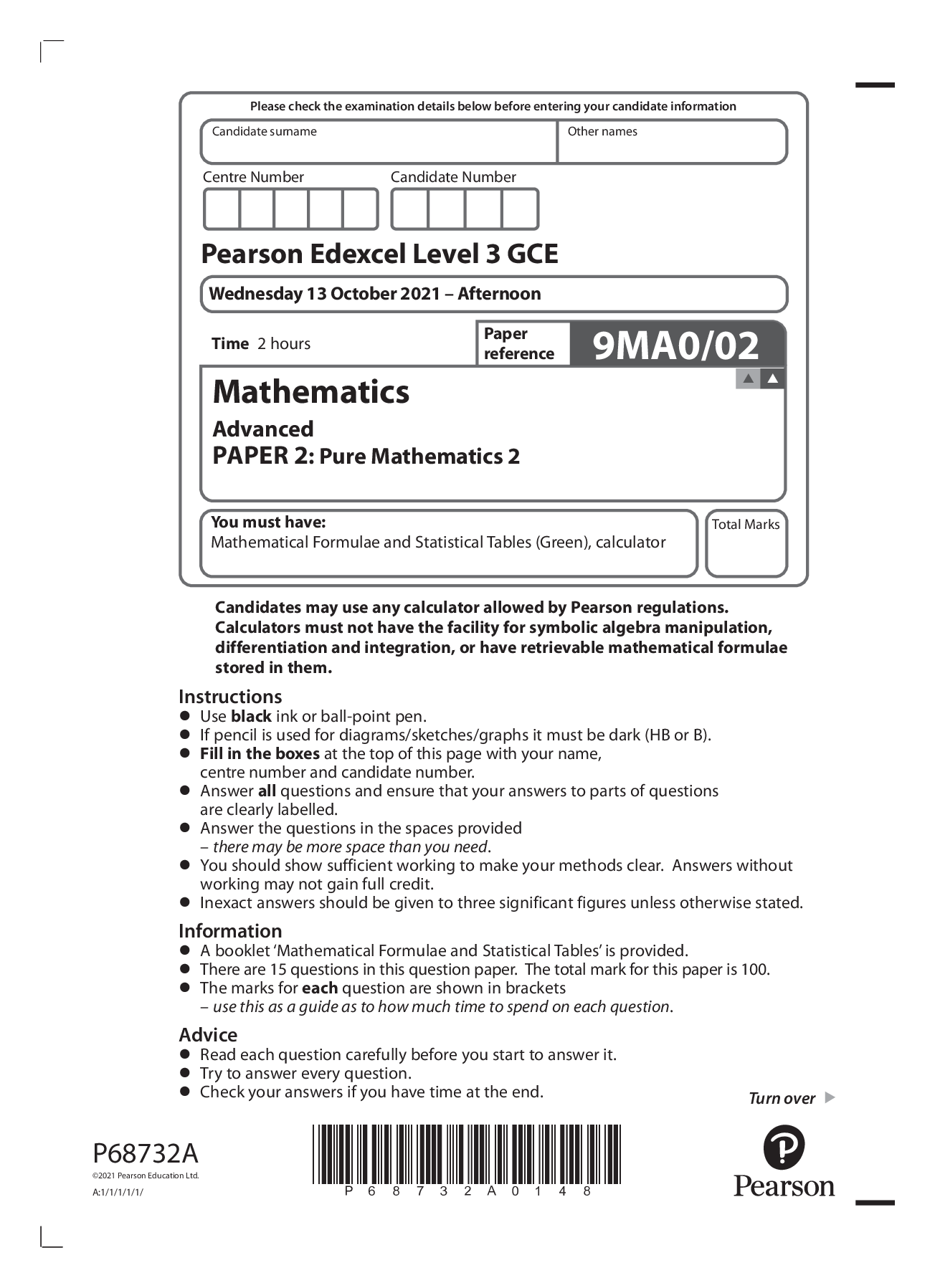 Mathematics > Edexcel > Pearson Edexcel GCE In Mathematics (9MA0) Paper 02 Pure Mathematics 2 (All)