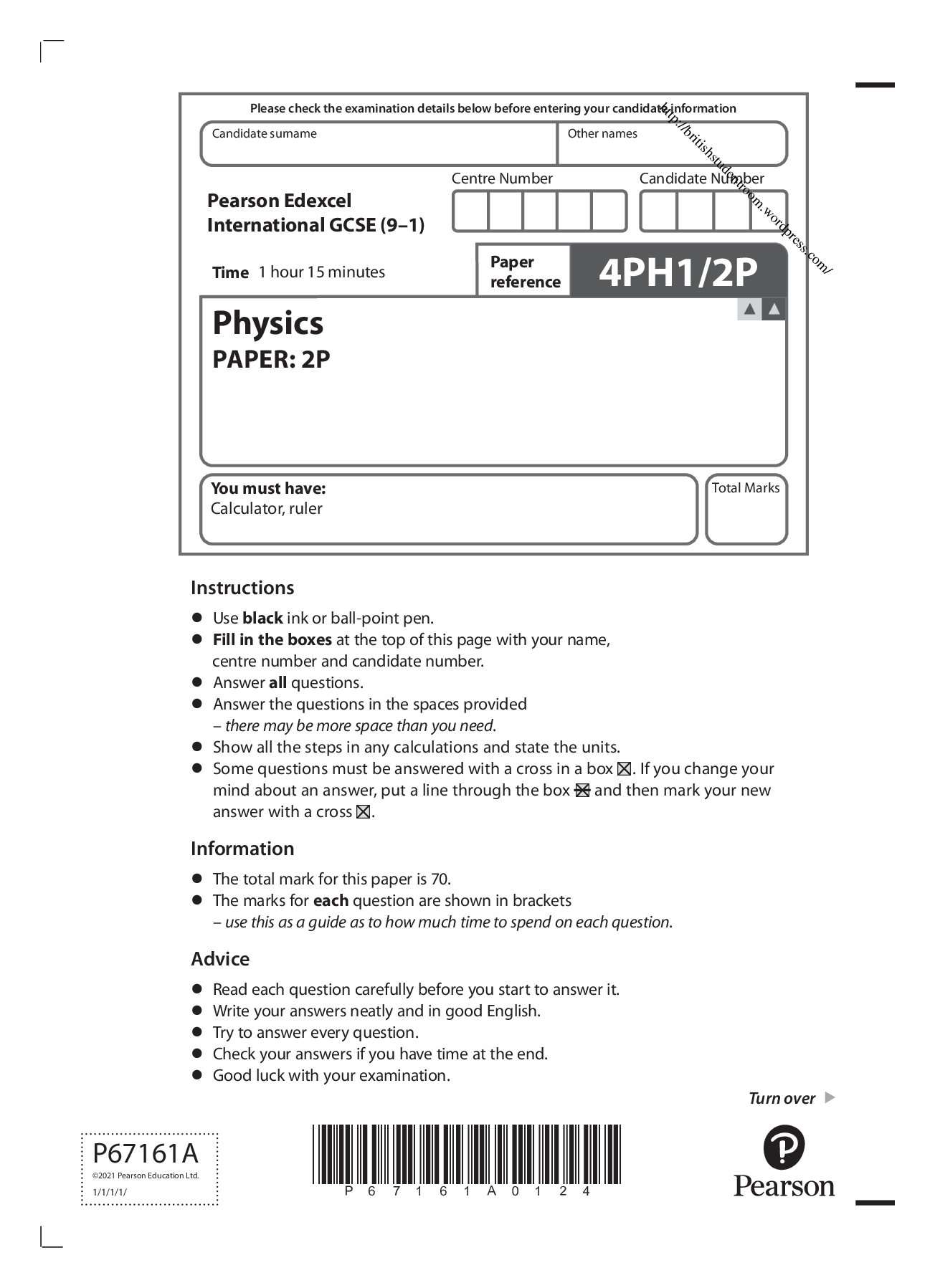 Physics > Edexcel > Pearson Edexcel Question paper + Mark Scheme [merged] (Provisional) Summer 2021 Pearson Edexcel International GCSE In Physics (4PH1) Paper 2P (All)