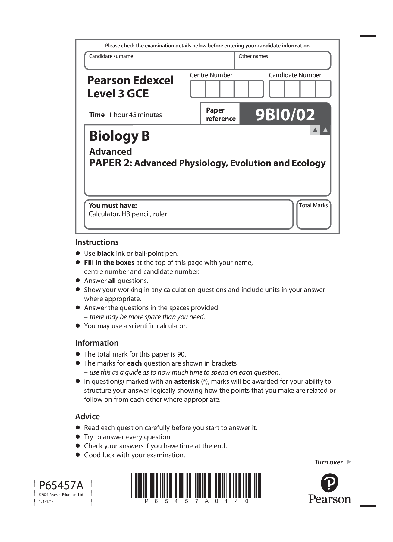 Biology > Edexcel > Pearson Edexcel GCE In Biology B (9BI0/02) Paper 2: Advanced Physiology, Evolution and Ecology (All)