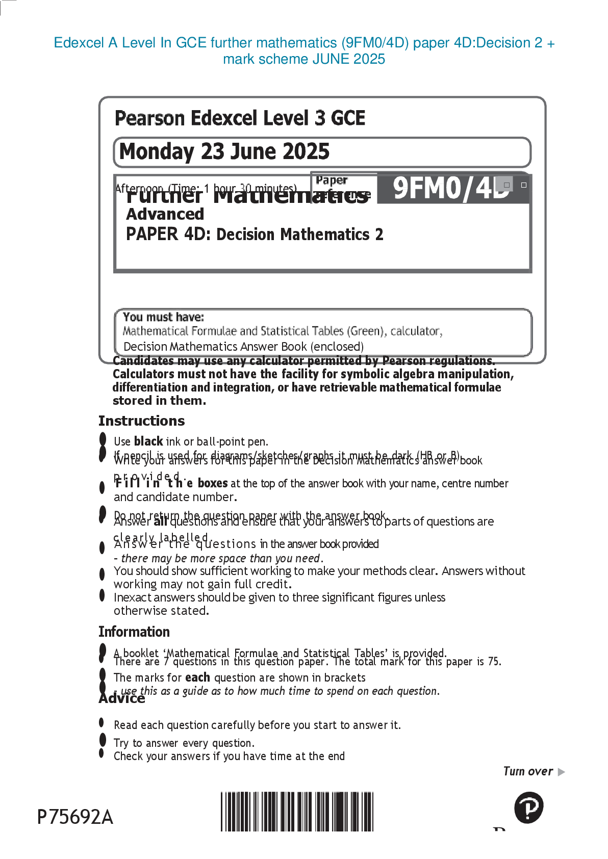 Mathematics > Edexcel > Edexcel A Level In GCE further mathematics (9FM0/4D) paper 4D:Decision 2 + mark scheme JUNE 2025 (All)