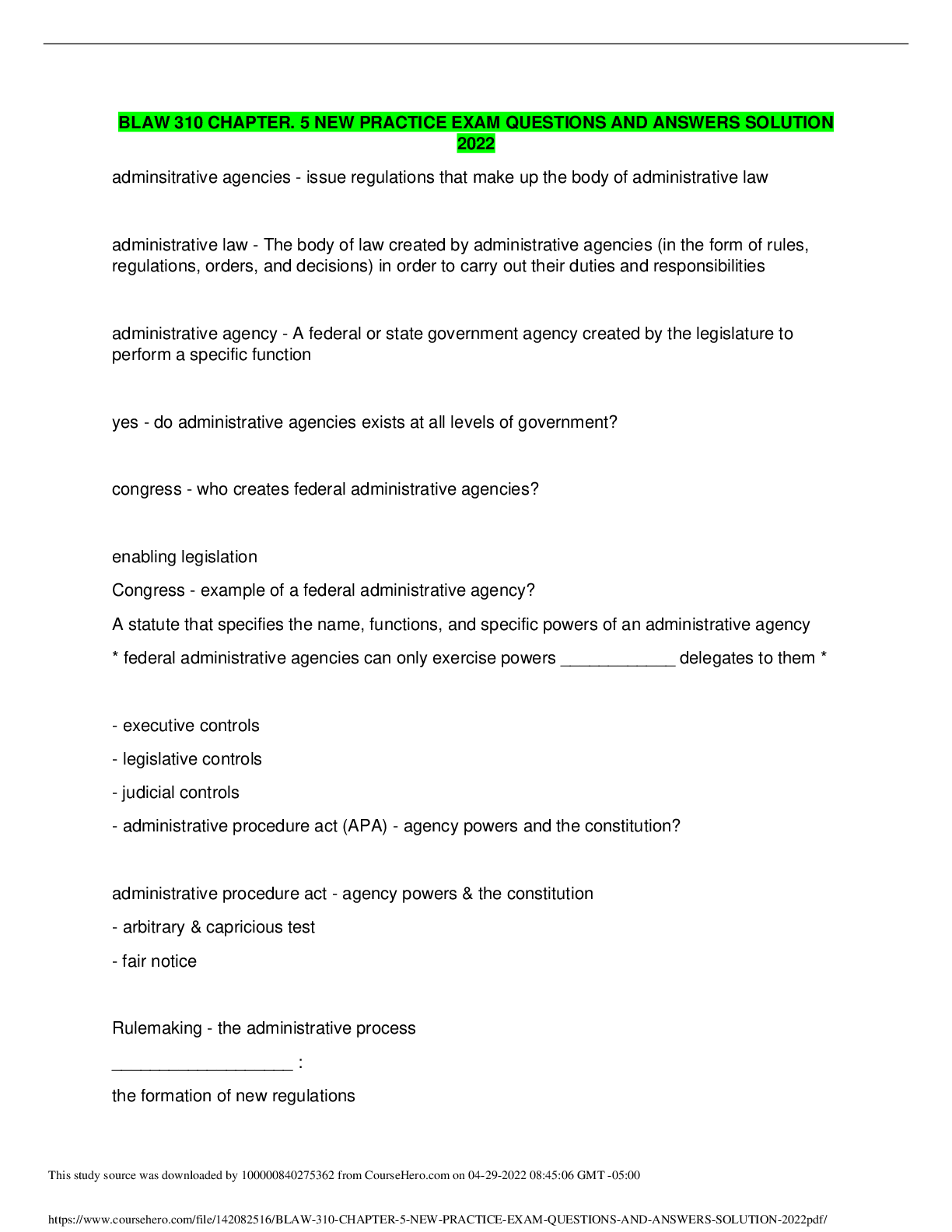 BioChemistry > Edexcel > BLAW 310 CHAPTER. 5 NEW PRACTICE EXAM QUESTIONS AND ANSWERS SOLUTION 2022. (All)