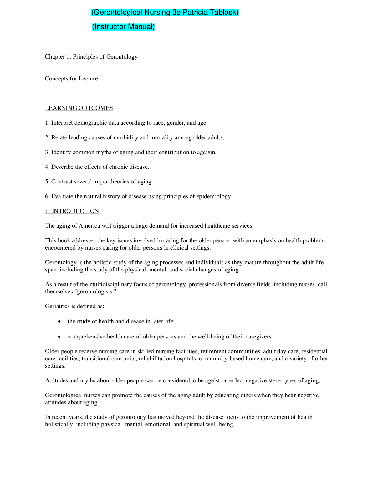 NURSING. > INSTRUCTOR MANUALS > Gerontological Nursing 3e Patricia Tabloski (Instructor Manual) (All)