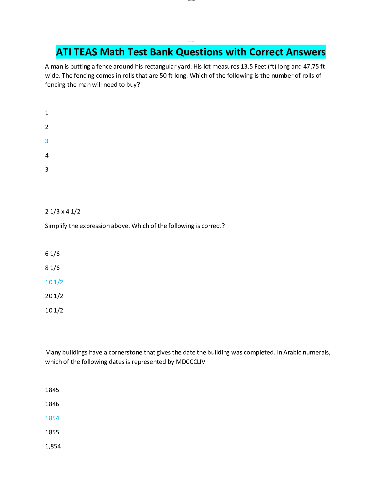 Health Care > Other Study Resources. > ATI TEAS Math Test Bank Questions with Correct Answers (All)