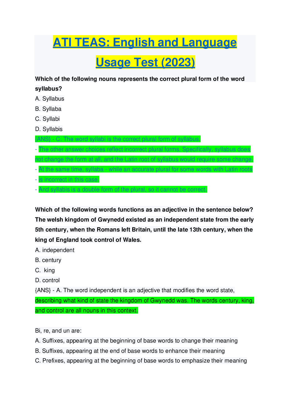 *NURSING > Other Study Resources. > ATI TEAS: English and Language Usage Test (2023) (All)