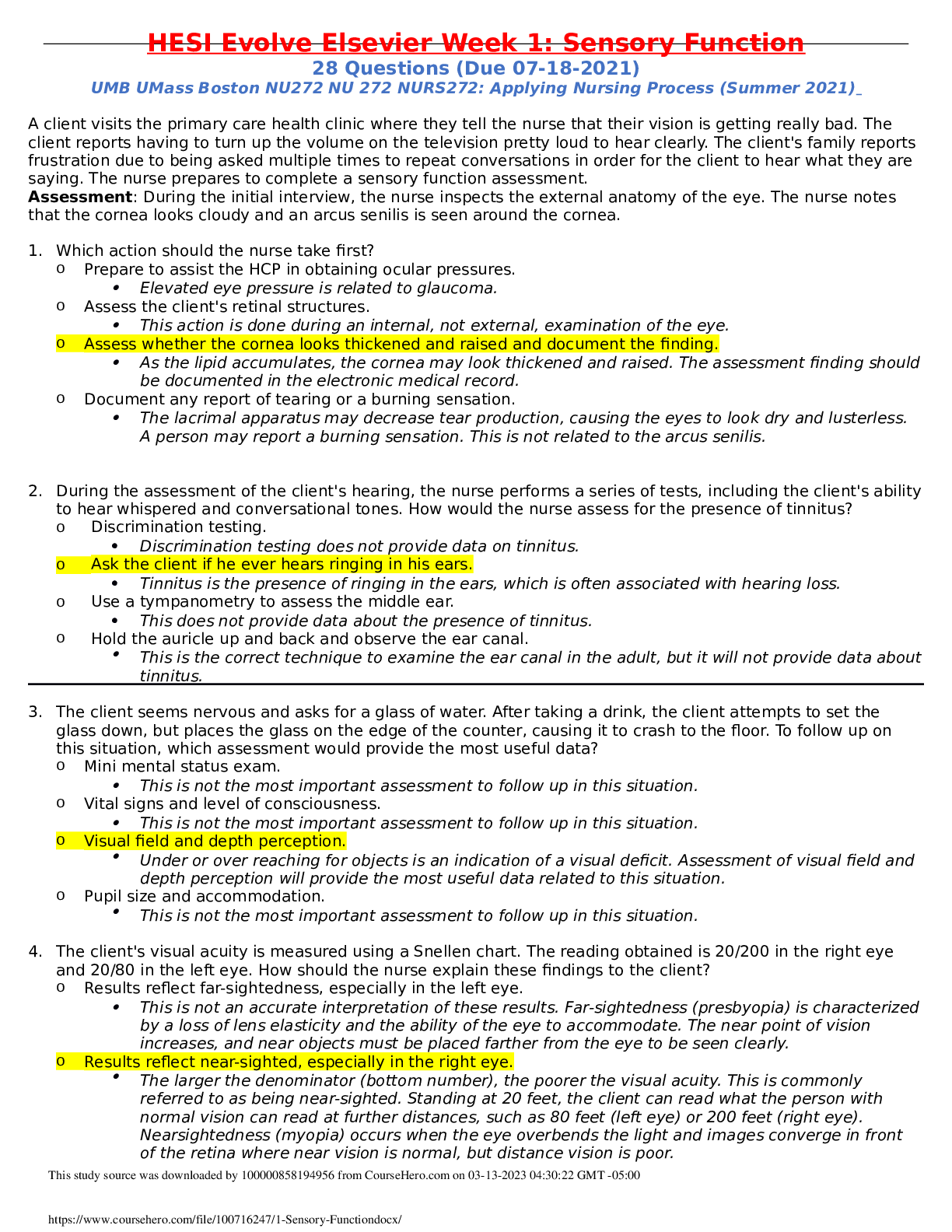 *NURSING > Other Study Resources. > NU 272 HESI Evolve Elsevier Week 1 Sensory Function (All)