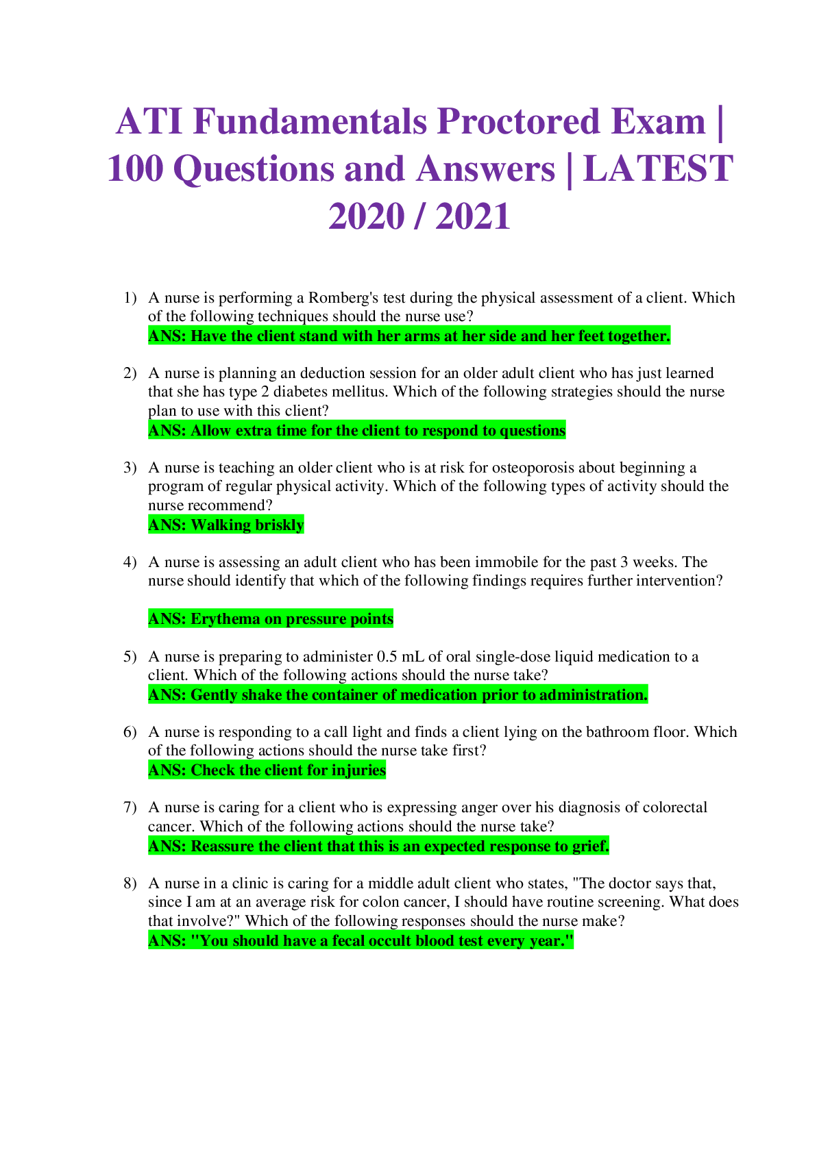 Health Care > ATI > ATI Fundamentals Proctored Exam | 100 Questions and Answers | LATEST 2020 / 2021 (All)