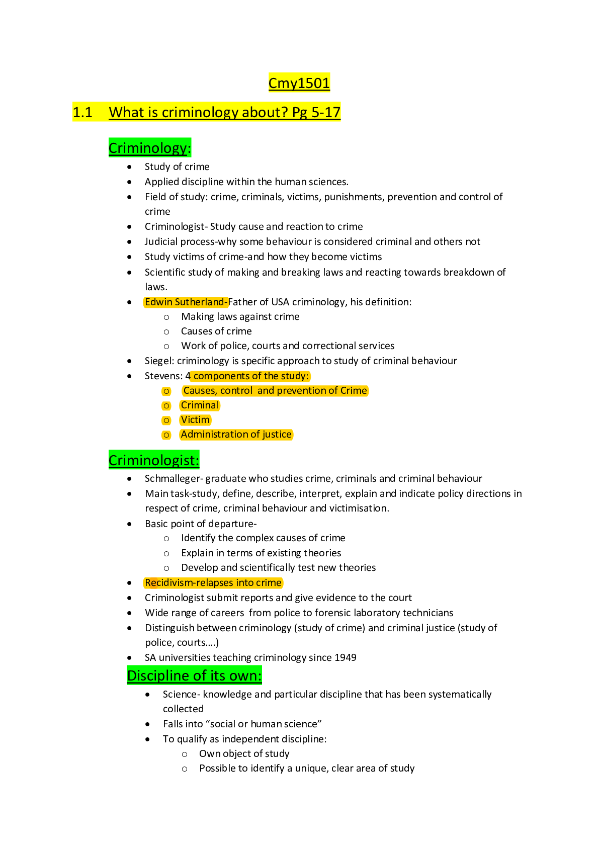 Criminology > Class Notes > CMY1501 – Introduction to Criminology: Crime, Offenders and Criminal Behaviour (All)