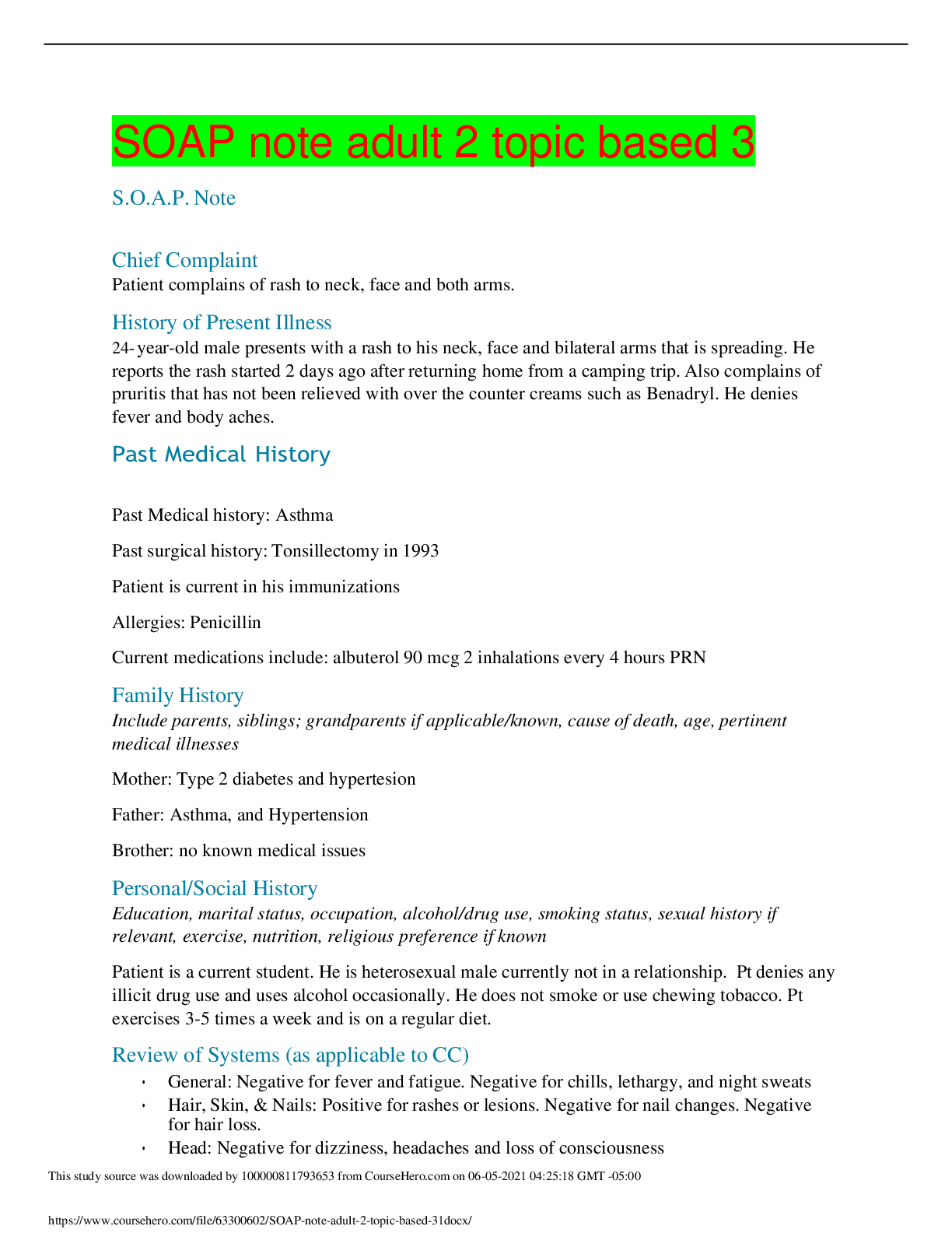 *NURSING > Class Notes > SOAP note adult 2 topic based 3 (All)