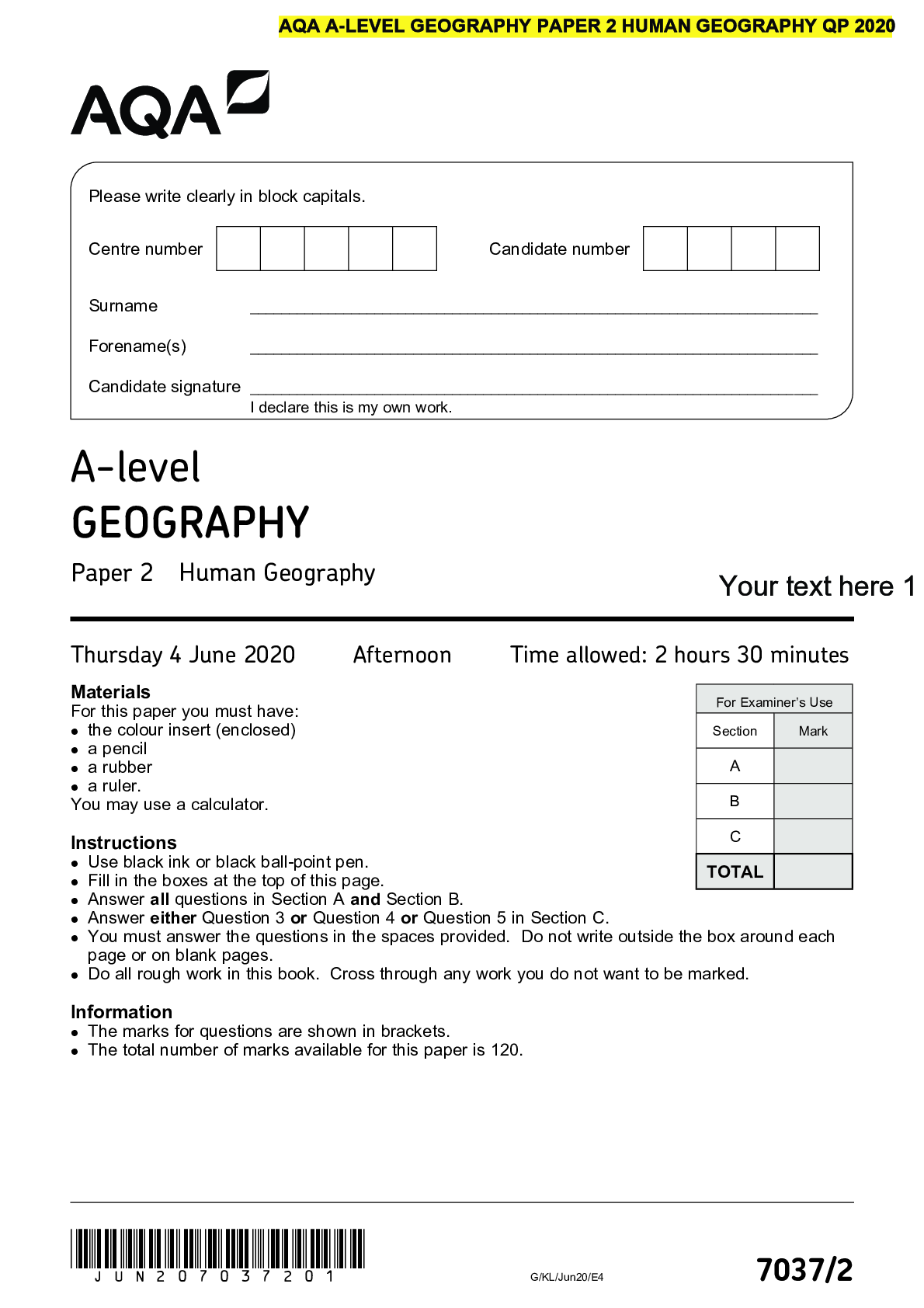 Geography > AQA Question Papers > AQA A-level GEOGRAPHY Paper 2 Human Geography QP 2020 (All)