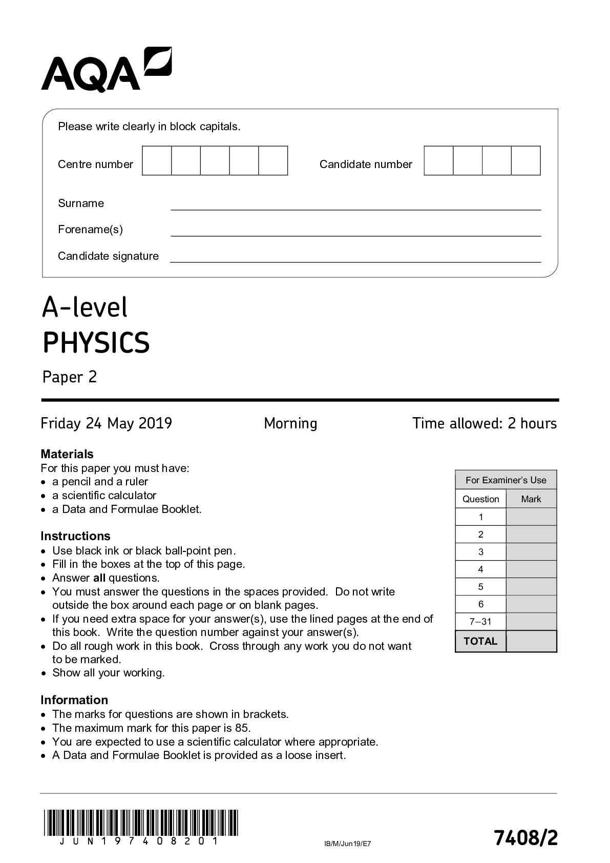 Physics > AQA Question Papers > AQA_A Level Physics_7408/2 Question Paper_2019 | Paper 2 (All)