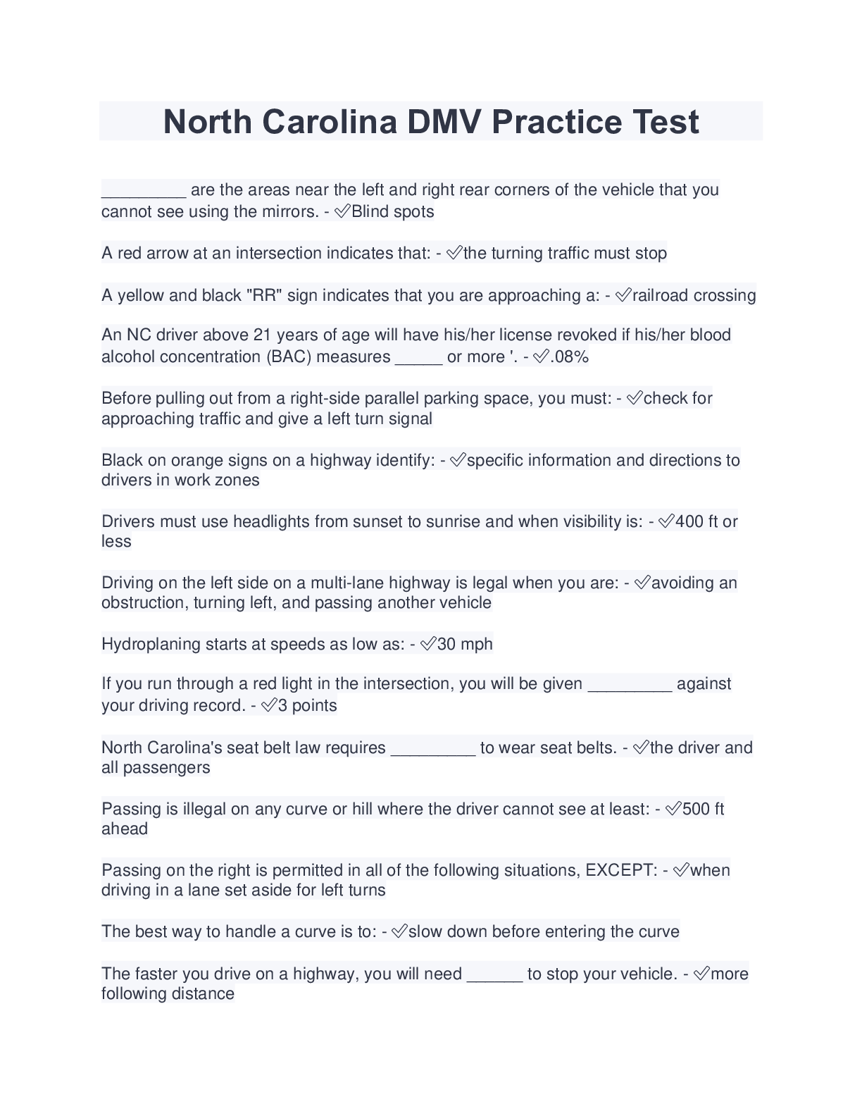 Engineering > ESSAY > North Carolina DMV Practice Test (Latest 2022/2023) Verified Answers (All)